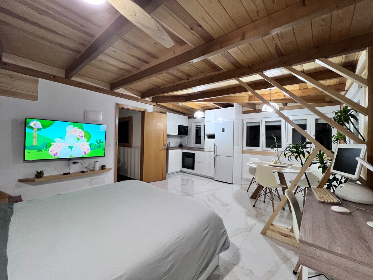 Bright and cozy apartment in Lajares with wooden ceilings and volcano views. Private top-floor unit of a quiet villa, featuring a bedroom with new mattress, full bathroom, and fully equipped kitchen. Glazed lounge opens to a sunny terrace and garden with loungers. Surf area with outdoor shower. Ideal for couples or remote work. 500 m from Lajares center and 10 min from El Cotillo and Corralejo beaches. Peaceful, natural vibe.