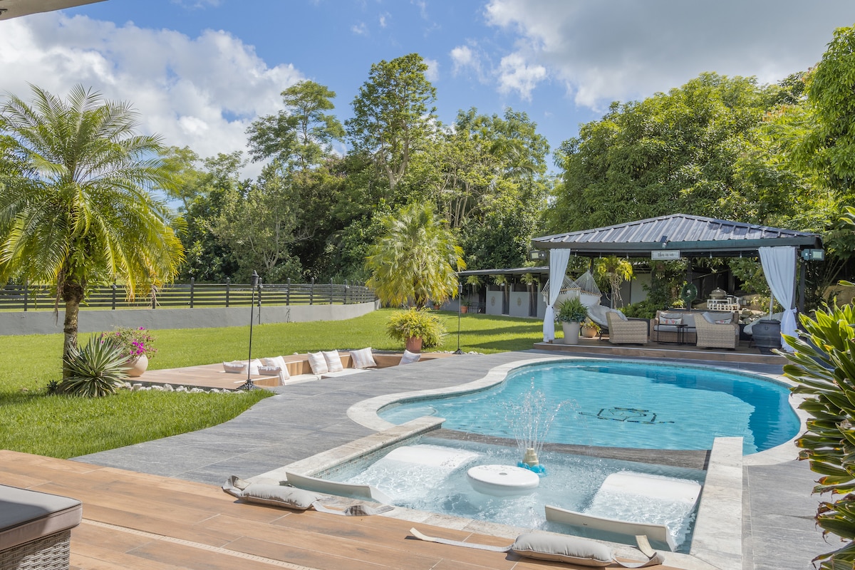 Kick back and relax in this calm, stylish space. First floor Apartment With King Bed and Futon in the living space and air mattress if needed. Max of 3 guest Excellent location 3 minutes from PR-30, going up PR 198. 20 minutes from Beaches, and 30 mins from San Juan Airport, Beautiful Private Pool, Outside BBQ area next to pool with stove, refrigerator, and Grill Ceiba North Juncos PR Modern and extraordinary facade quiet and safe area.