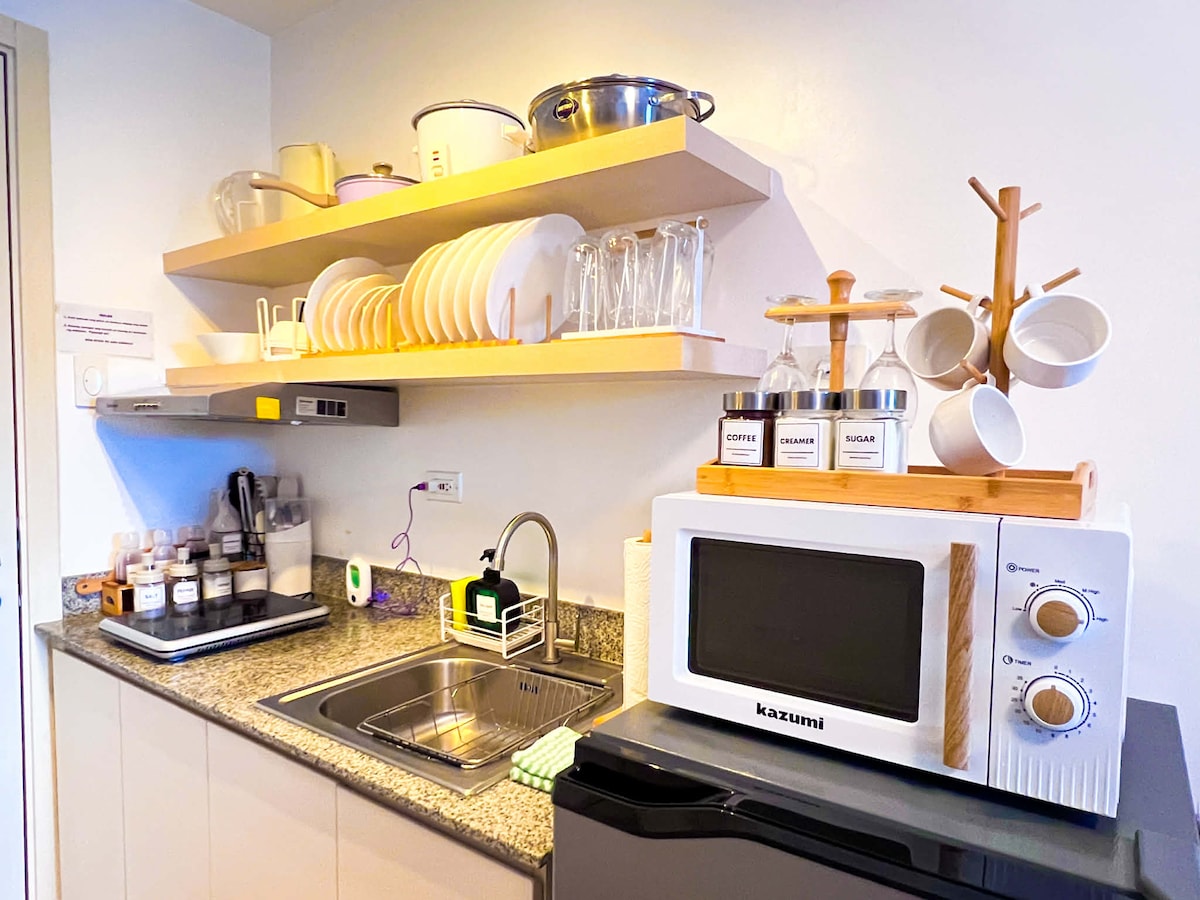 A better experience. A luxurious place. Bedroom & Living Area * WiFi * Air conditioning * Android TV with Netflix, Disney+, Prime Video * Dedicated workspace * Balcony * Queen-sized bed * Closet * Sofa Bathroom * Bidet * Shower heater Kitchen and dining * Refrigerator * Microwave * Electric kettle * Rice cooker * Cooking basics * Dishes and silverware * Induction cooker with range hood Safety * Smoke alarm * Smart lock * 24/7 CCTV Facilities * Adult swimming pool * Kiddie swimming pool