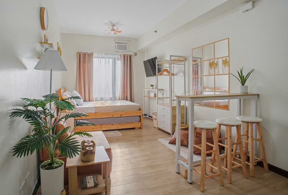 Our 1 bedroom unit with balcony has a full double size bed with pull-out bed, a kitchenette where light cooking is allowed. Unit has its own bathroom, 55” Smart TV with Netflix, Unli WIFI and a recliner sofa where guests can comfortably binge-watch! We also added Echo Show w/ Alexa (Spotify ready) The place is just a 3-5 minute walk to SM southmall and very accessible to almost everything. The unit is perfect for responsible guests who are traveling by themselves or their partner and child.