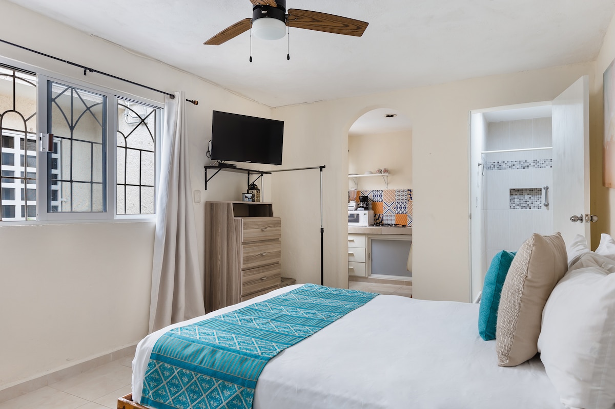 Este pequeño estudio con cocineta es perfecto para 1 o 2 viajeros que busquen experimentar la vida local de Cancún y alrededores. Ubicado en el corazón de Cancún en uno de los primeros barrios de esta joven ciudad. IMPORTANTE!! Hay un impuesto local (Saneamiento) el cual deberá ser pagado al momento de la llegada o salida, $85 pesos por noche, Pago en efectivo o con tarjeta por medio de airbnb.