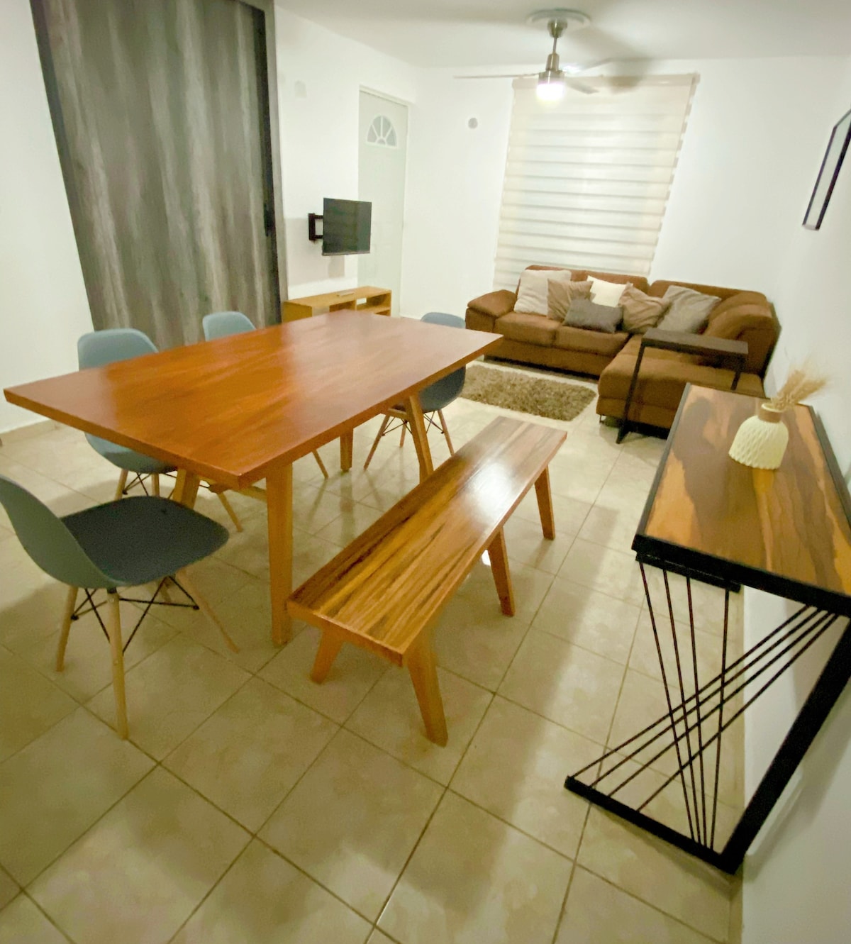 Céntrica casa en residencial privada y de arquitectura moderna. El área es grande y espaciosa, con vistas llenas de árboles y jardines; Con amplios espacios y otros muebles como la silla mecedora de la sala en lo que disfrutas la televisión, trabajas en la computadora o lees un libro. La cama es suave y cómoda con un tamaño ideal para descansar, el baño amplio, la cocina equipada y el cuarto de lavado te hará sentir como en casa. ¡No olvides preguntar por el parque y los juegos de mesa!