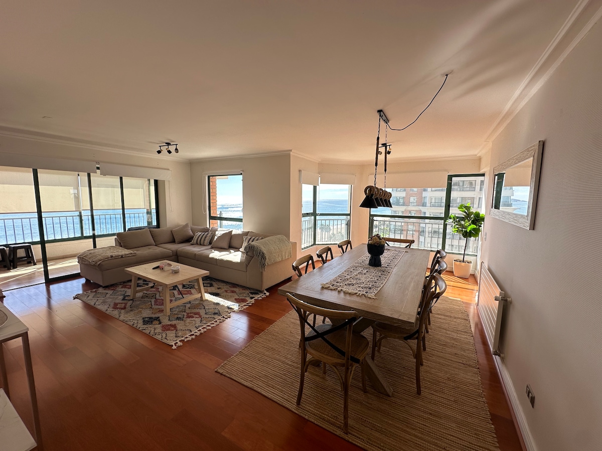 Departamento de lujo en primera línea con una de las vistas más espectaculares de Viña del Mar. Amplio y totalmente equipado para 8 personas, cuenta con 4 dormitorios, 3 baños, cocina completa, WiFi, TV y lavadora. Incluye 1 estacionamiento subterráneo y opción a un segundo sujeto a disponibilidad. El edificio ofrece piscina, gimnasio y conserjería 24/7, a pasos del Mall Marina Arauco y Av. San Martín.