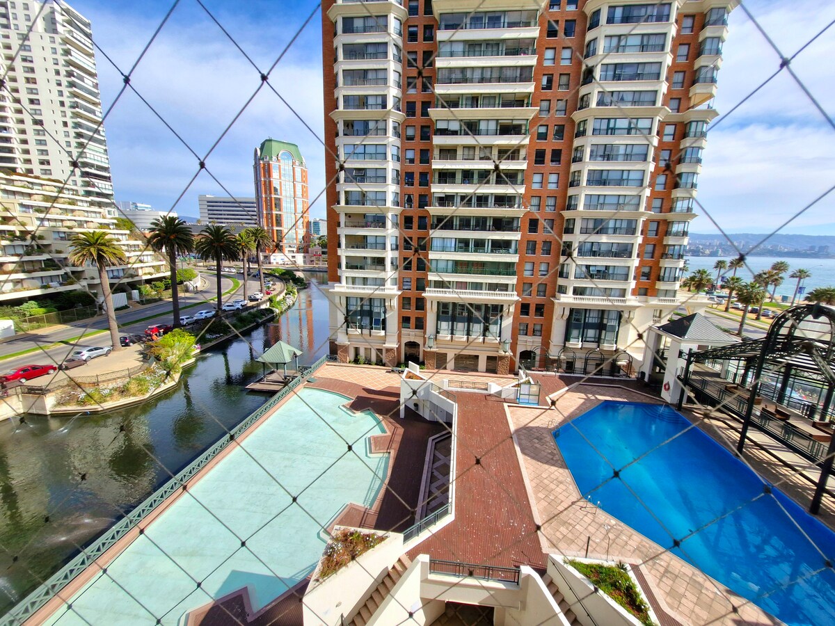 Este elegante alojamiento frente al mar es ideal para viajes en familia o amigos. El Complejo cuenta con muchos servicios, piscina climatizada adultos, piscina niños, gimnasio, sala de juegos, etc. Esta caminando cerca de malls, supermercados, restaurants, casino, etc. Departamento frente al mar, con ascensor exclusivo, solo dos dpto por piso, piso 20. Recién remodelado, muy bien equipado con todo lo necesario para pasar unos lindos dias.