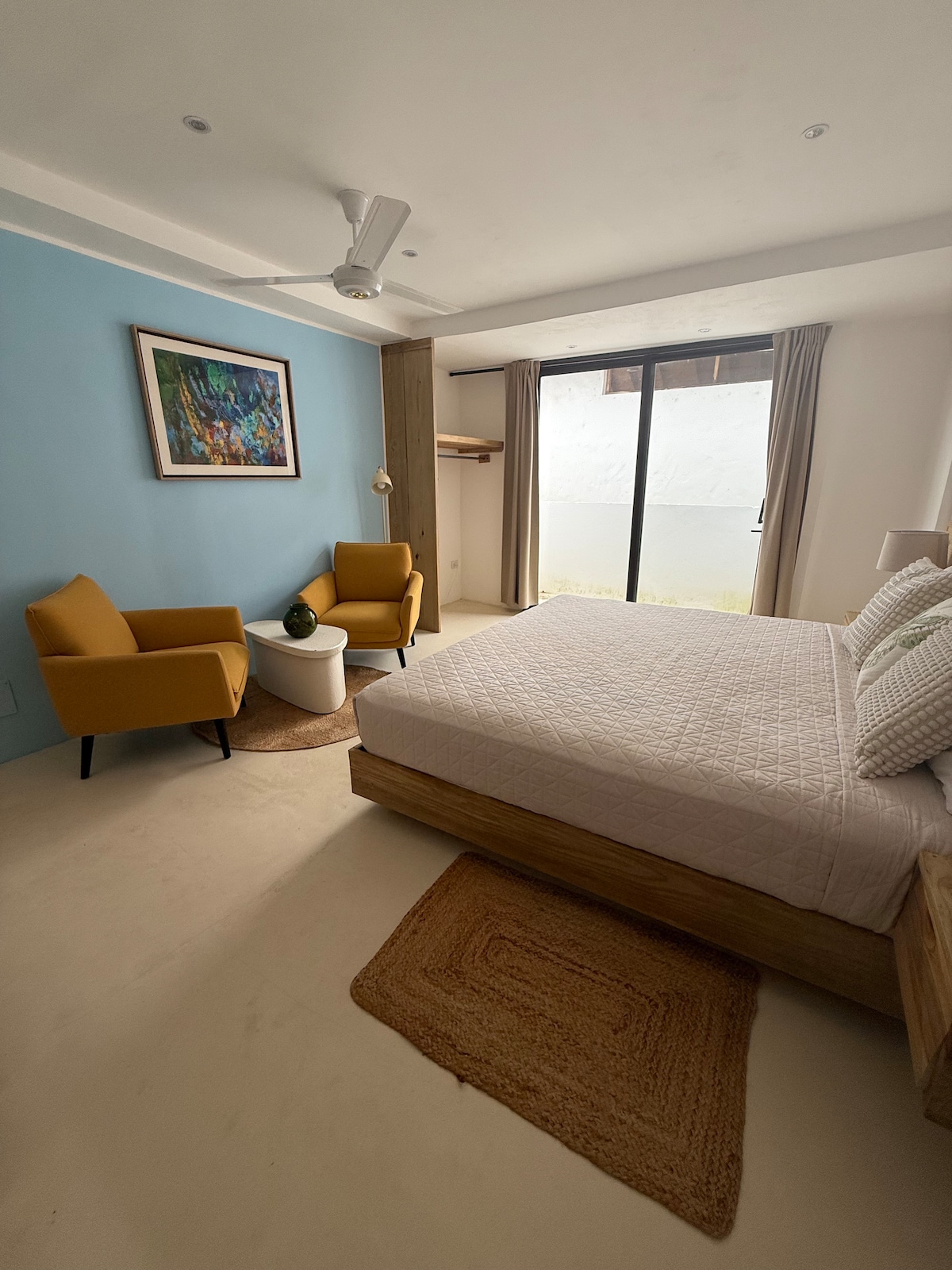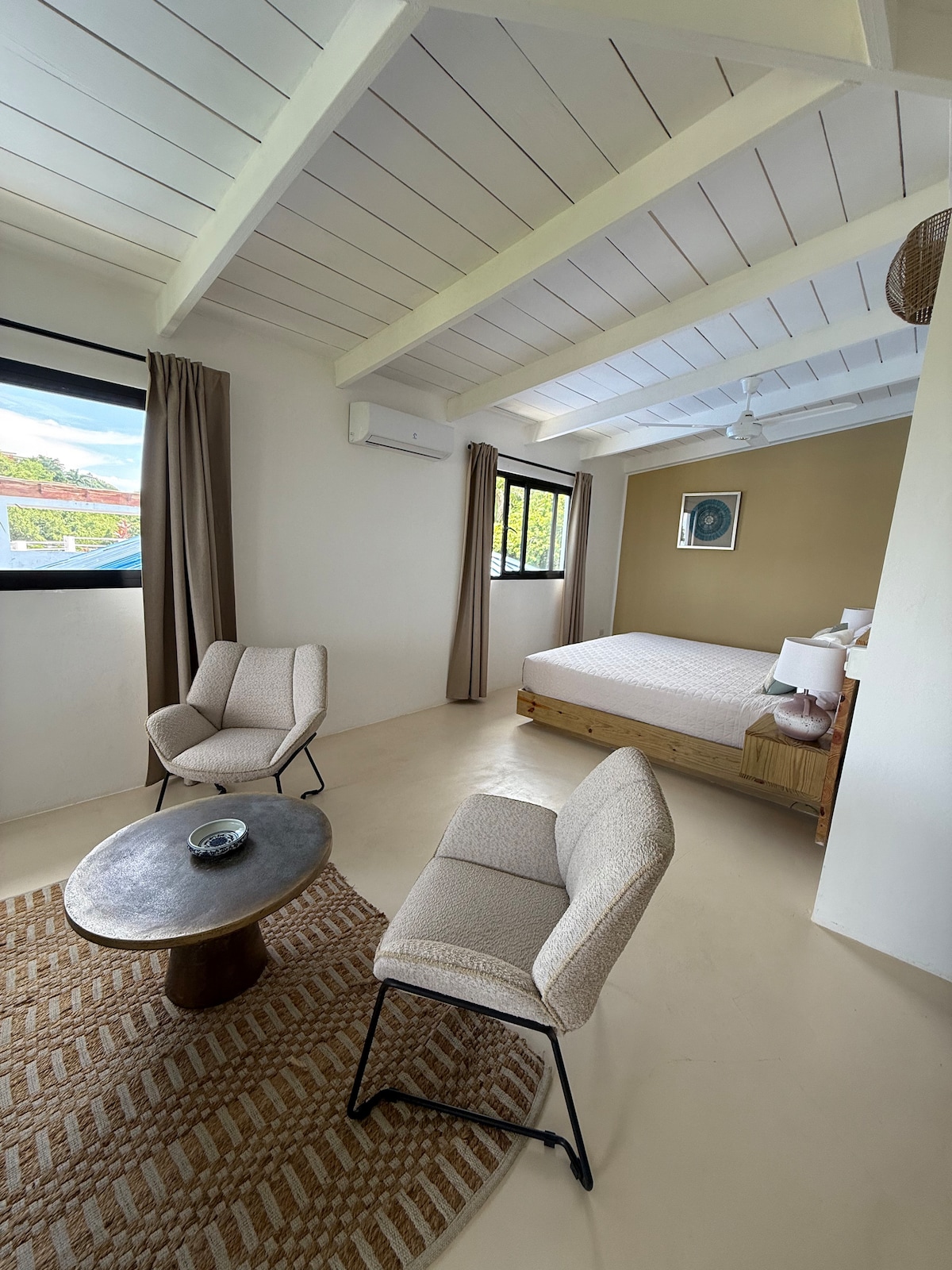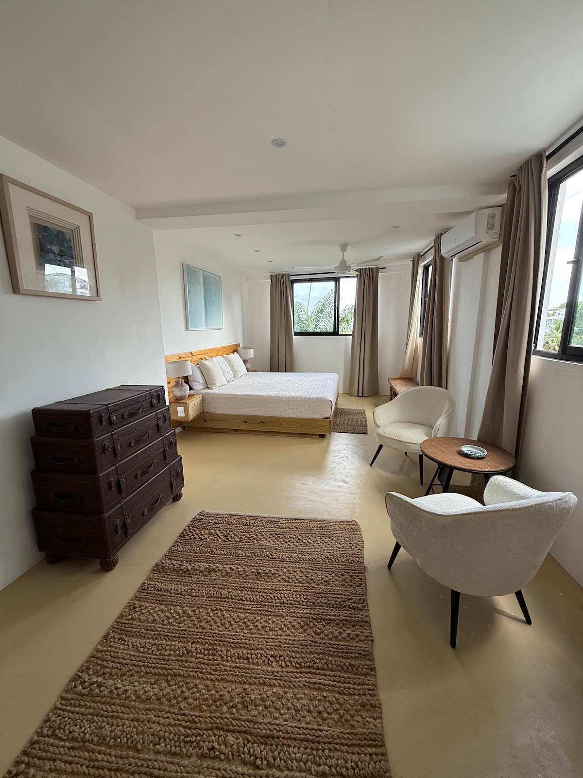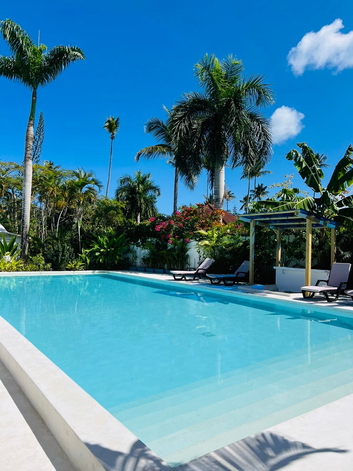 Escape to paradise at our newly renovated, spacious boutique hotel. Our eco-friendly hotel is steps from the beach in the heart of Las Terrenas! Wake up to stunning ocean views, unwind by our luxurious three-tiered pool surrounded by palm trees, or feel the ocean breeze as you relax in the sun. With tropical serenity, modern luxury, and the beach just minutes away, your perfect getaway awaits! The Suite Includes a king size bed, ensuite bathroom, and air conditioning.