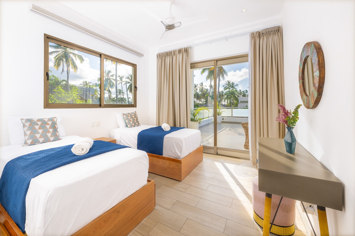 🌞4 Br Duplex Penthouse located in "Balcones del Atlantico" complex🌞, the premier luxury complex in Las Terrenas, famous for its white sand beaches, authentic bistro cuisine and lively nightlife. Our property has a private jacuzzi + terrace, and housekeeping staff. Staff is also available to cook breakfast and lunch for an additional fee of RD$1,500 per day. 🏖️The complex: -3 POOLS🏊🏻 - Private beach club and restaurant w/ renowned chef🌊 - Beach football⚽️ - Gym🏋🏻♀️ -"Padel court" -Game room🏓