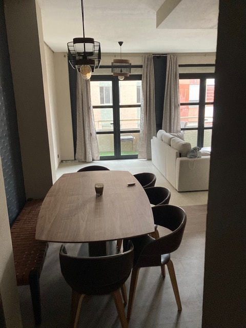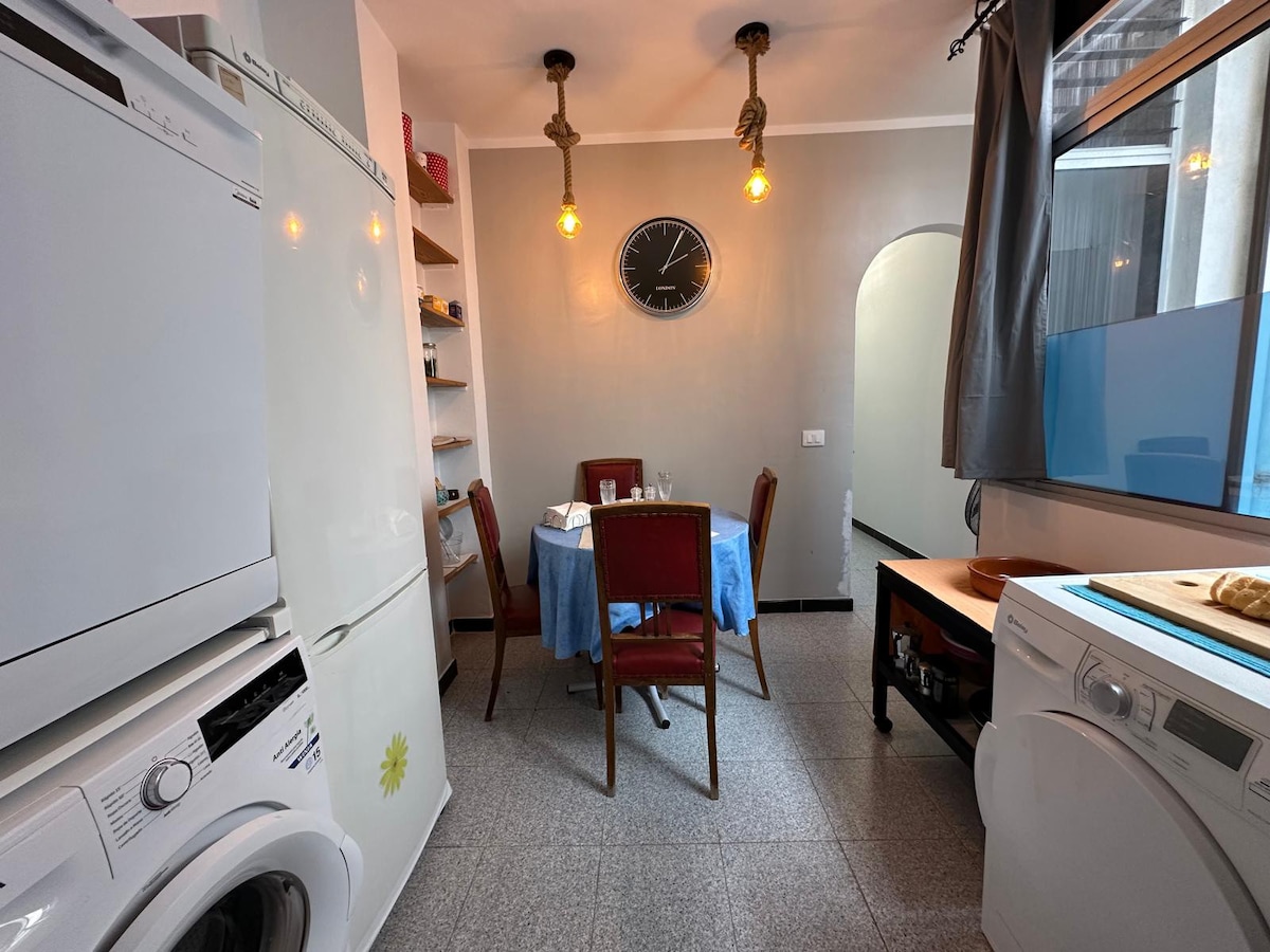 The López Apartment, located at street level, has a studio-style layout. Its layout is detailed below: - Living-bedroom: This multifunctional space combines the living area and the bedroom. It has a double bed and a sofa-bed for two people (140 cm wide). It is the perfect place to rest and receive visitors. - Kitchen: The kitchen is equipped with a four-ring induction hob, a microwave and a small fridge. It also has a table for four people, ideal for enjoying meals in company.