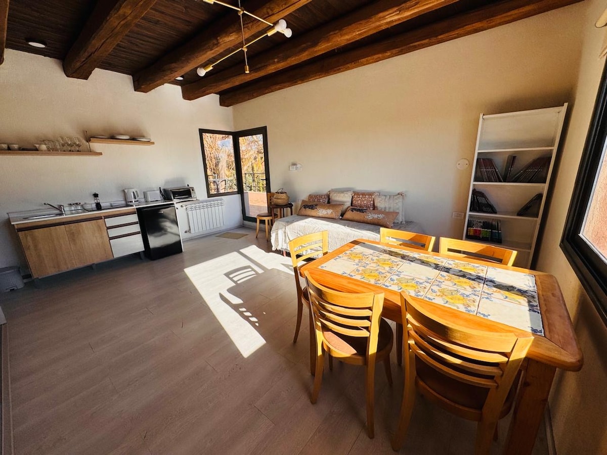 Disfruta de la calidez y encanto de este acogedor monoambiente totalmente equipado, ubicado entre viñedos en el corazón de Chacras de Coria. Este tradicional barrio, a solo 15 minutos de la ciudad, se distingue por sus paisajes, su plaza principal con su antigua iglesia y sus alrededores repletos de cafés, negocios y gastronomía de primer nivel. Vení a vivir una experiencia auténtica y encantadora en la tierra del vino. Opción desayuno con un costo extra. Pileta disponible a partir de Noviembre