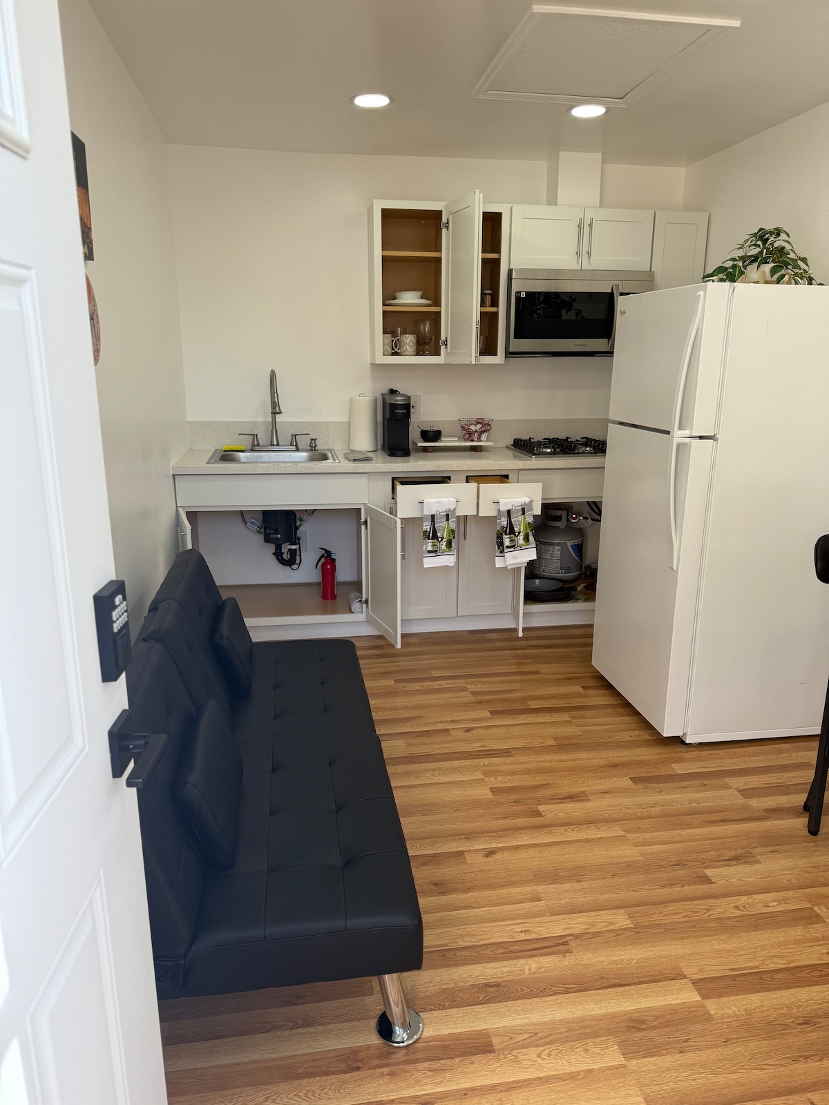 luxurious studio with private entrance, all decorated in black and white colors, has a kitchen with all kitchen accessories, queen bed, folding bed for another additional person, tv , air and heating are individual for the rest of the house since the studio has a mini split installed, it has a smoking area outside