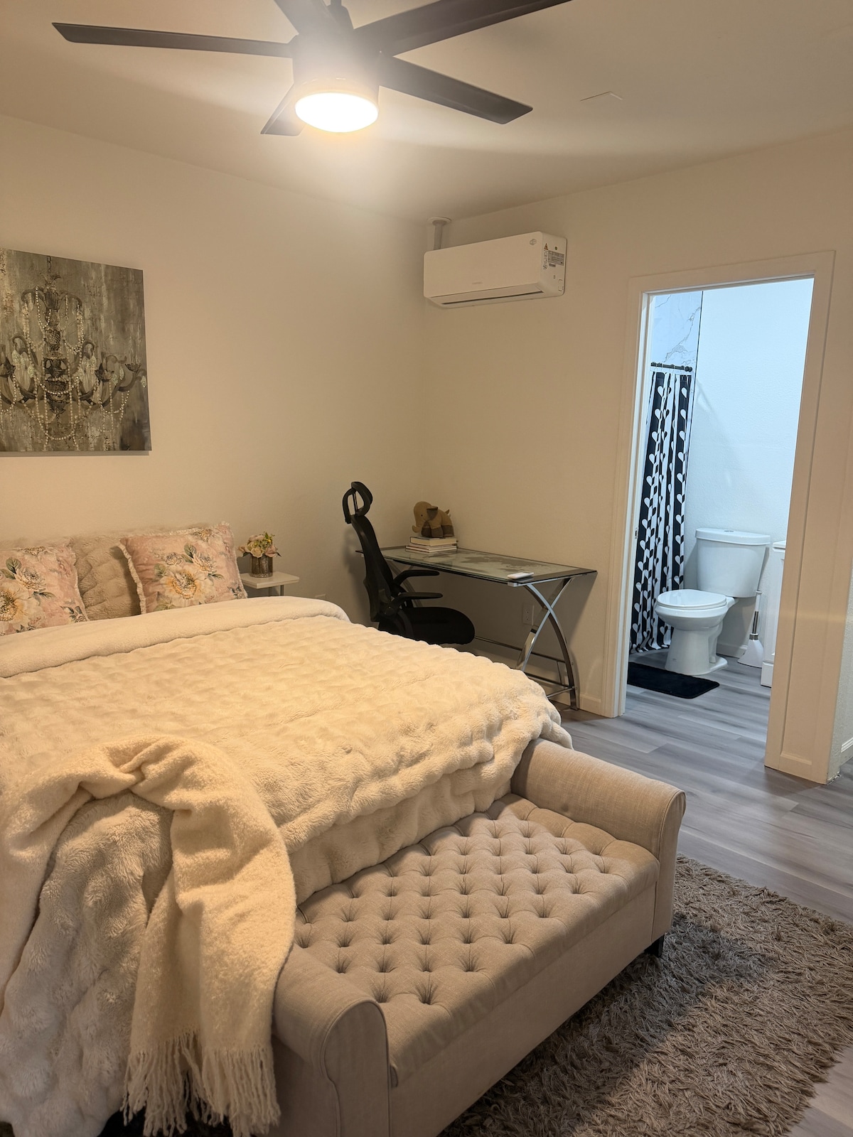 A guesthouse (casita) within a 1-acre compound that’s 8 minutes from the airport, 10 minutes to the Strip and less than 15 minutes from the new Allegiant Stadium. The casita consists of 3 mini-suites (a bedroom with private full bathroom), a living/dining room, full kitchen, laundry and powder room. Common area outside of the guesthouse includes the pool, spa, exercise room, pickle-ball court, bocce court and patio with a gas and an electric BBQs. FOR NO SHARING OF COMMON AREAS—See Below.