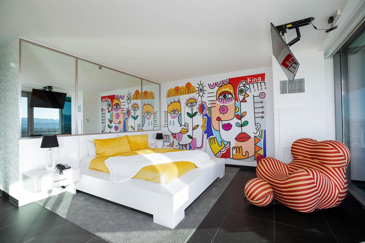 Welcome to Palms 37! Experience Vegas in style at this ultra-modern, one-of-a-kind 1BR suite with a massive wrap-around balcony and breathtaking views of the Las Vegas Strip. This upgraded suite features sleek, custom interiors, a fully equipped kitchen, a convenient coffee bar, and floor-to-ceiling windows that bring the energy of Vegas right to your doorstep. Enjoy FREE high-speed Wi-Fi, FREE parking, and direct access to the Palms Casino. Just a short walk to the Strip, nightlife and dining!