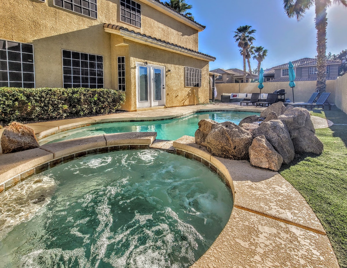 Consistent 5⭐ and Guest Favorite for a reason! With this house you get 15 beds, heated pool, hot tub, pool table, chef's kitchen, mini golf, arcades & games, 10 smart TVs, BBQ, and more! This big, well-appointed, resort-style home can host your entire group under 1 roof comfortably. You'll be the hero of your group for booking. And it’s less than 10 minutes from The Strip or Fremont Street! Perfect for family reunions, business travelers, or wedding groups. Book now before dates are taken!