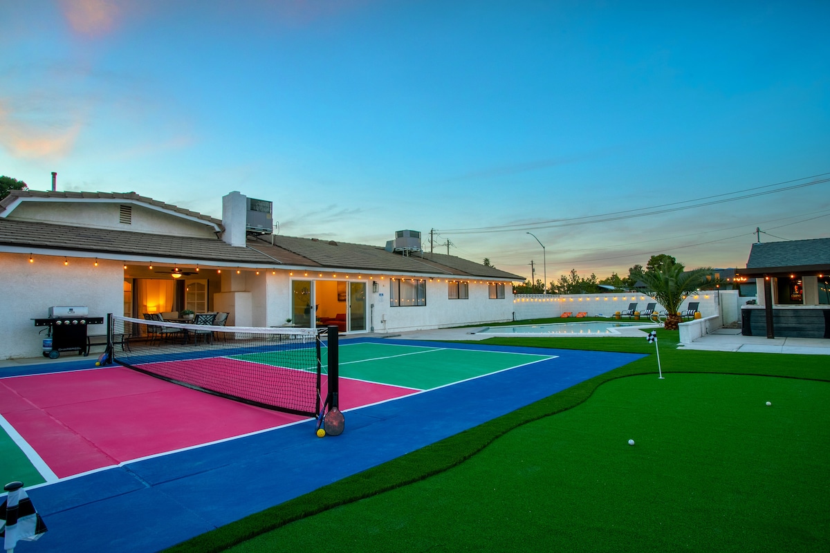 Welcome to my modern completely remodeled 1900 square foot house!. Basketball court, golf putting green and a decking with a strip view. Sunken pit sitting area. House was built in 2019 and nobody lived in it until 2022. Amazingly beautiful views from the backyard and house. Very spacious and accommodates up to 8 people comfortably. 25 foot heatable pool and jacuzzi. High speed internet and a basic cable subscription. Each bedroom has it's own smart TV and the living room has a huge smart TV.