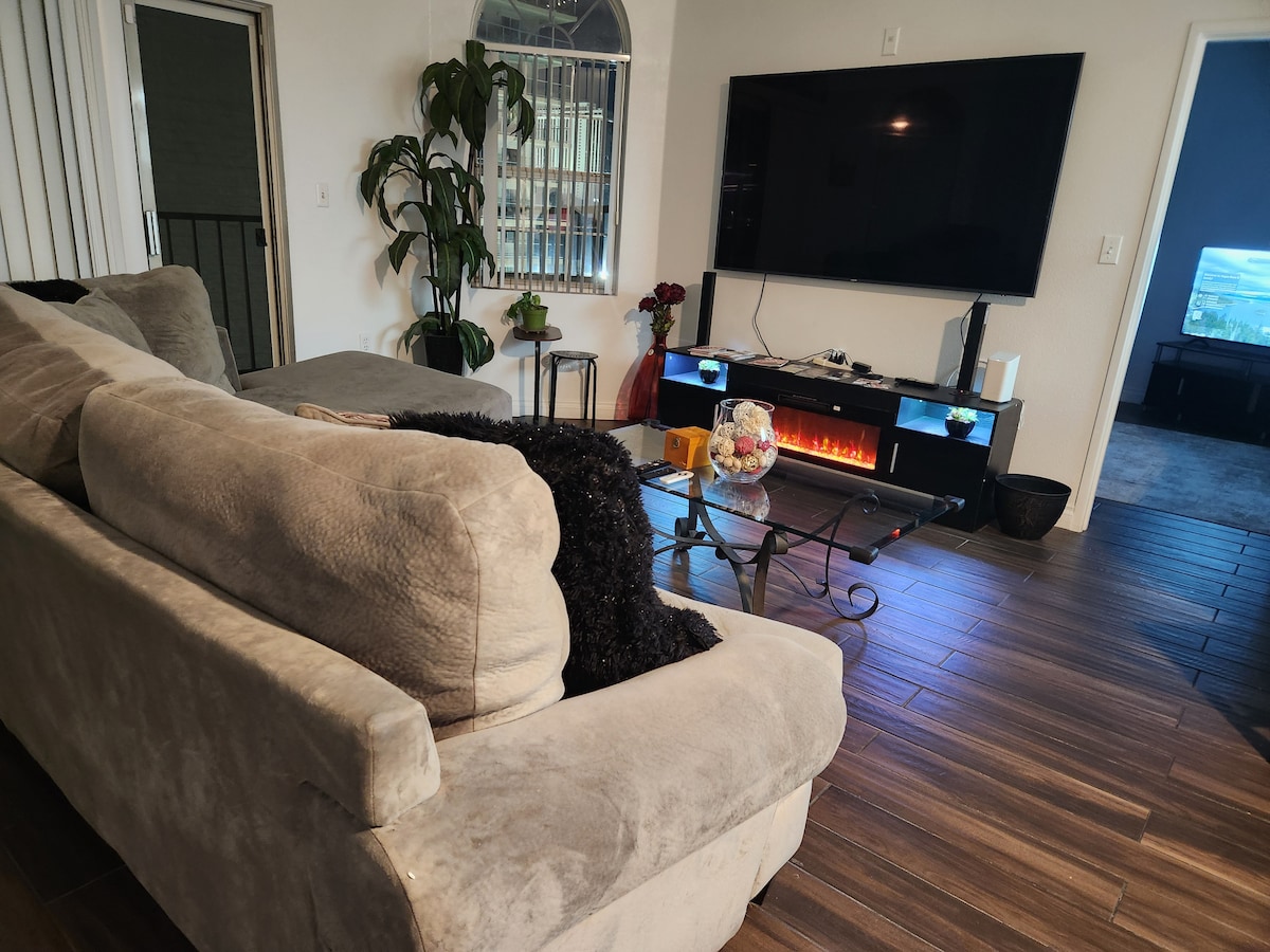 This cozy 1 bed 1 bath condo sleeps 4. It’s comfortable and well appointed with a king size bed, full size sofa sleeper, and cable/Wi-Fi, 65” smart tv in the living room and 55” smart tv in the bedroom, balcony seating off the living room, remote candle lit fireplace, and modern furnishings throughout. The grounds offer two pools, a Jacuzzi, outdoor shower, gym, 24 hour guard attended entrance, with free parking. Located just off the strip, close to casinos, Allegiant Stadium, and more.
