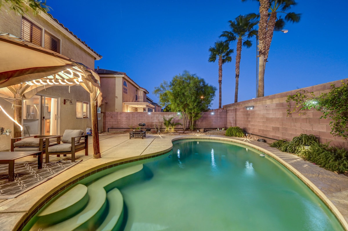 ☞ 2,373 sq feet | 213.7 sq meters. ☞ 5 private bedrooms ☞ 9 beds ☞ Huge private lap swimming pool ☞ Private jacuzzi available year around ☞ 6-person Sauna for relaxing year around ☞ BBQ and pergola ☞ RV Parking and private 2-car garage ☞ E-bikes for rent ☞ Private poker & media room, 75" TV, Poker Table ☞ Full bedroom and bathroom downstairs ☞15 minutes east of the Las Vegas Strip, and airport ☞ Fully equipped kitchen with all oven, dishwasher. ☞ Clark County STVR License Number: 2006540
