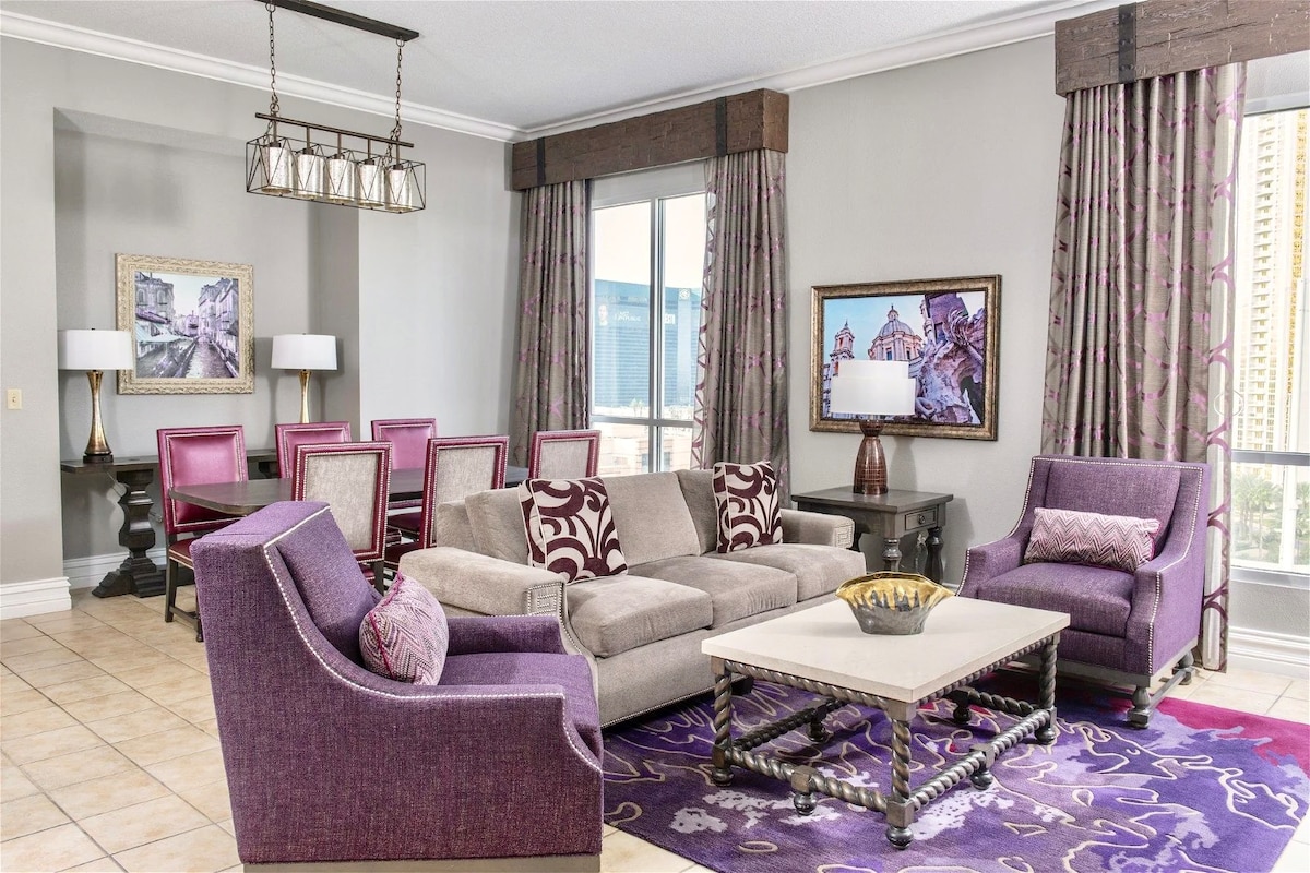 Discover luxury in this 1BR/1.5BA suite at Palms Place Resort, offering an unforgettable LV experience. 1220 sq. ft. of open-concept living with full-length floor-to-ceiling windows framing stunning views of the Strip and mountains. Relax in the jetted tub or under the rainfall shower head. Accommodates with 2 King beds and a sofa bed. Located 1 mile west of the Strip, connected to Palms Casino. Enjoy 24hr check-in, complimentary parking. NO RESORT FEE! Ideal for a remarkable Las Vegas stay.