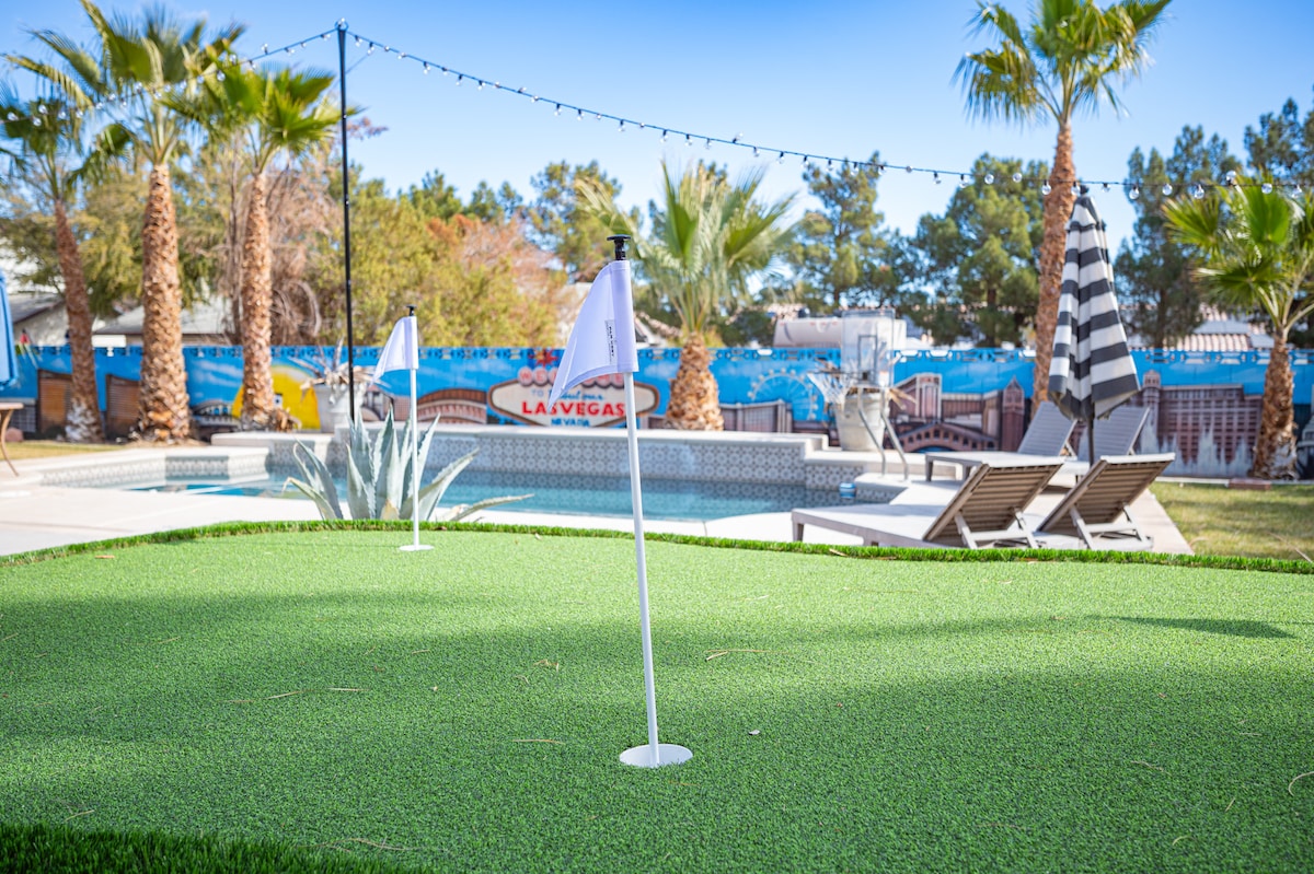 4 bedrooms (1 King/3 Queens), 2.5 bath/ 2200 sq ft home with pool/spa and putting green (pool heat xtra). Games room, well stocked kitchen, living room with 60” smart TV, beautiful heated pool & relaxing spa. Waterfall, & putting green help you enjoy beautiful Henderson in the Mission Hills area. 20 min drive to Las Vegas strip or Boulder City. Outdoor space includes lounge chairs on newly resurfaced pool deck, outdoor table with seating/ lounge area on covered patio. See details for more info.