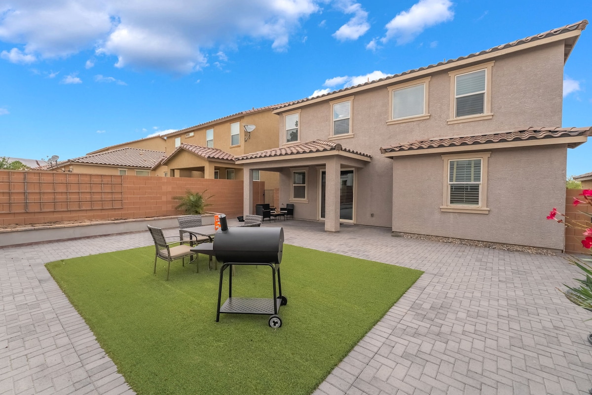 Beautiful and spacious 4 bedroom/3 bath with 5 beds/bean bag turns into a double mattress . Home located less than 3 mil from the Strip/Airport. Master Suite with private bathroom. 86in TV in family room . Fully Stock kitchen for any occasions. Dedicated workplace in all rooms. Up to 1 GB of fast internet for all your streaming, working, video call for your group. 2 arcade games and a poker table. Private in ground pool. Outdoor BBQ also Located on Private cul-de-sac. Family and pet friendly.