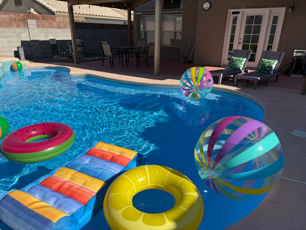 Spacious 3-bedroom house with a pool & Hot Tub, featuring a private backyard oasis perfect for relaxing under the sun. Fully stocked with plush towels, cotton sheets, quality mattresses, and all the kitchen utensils needed for any level of cooking. Just a 16-minute drive to the famous Las Vegas Strip, and close to convenience stores (supermarkets, restaurants), parks, and the Lakes neighborhood. Nestled in a quiet, safe neighborhood just minutes from Summerlin.