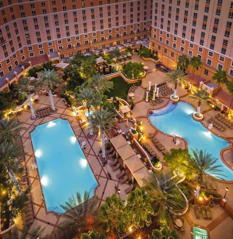 A Mediterranean-style vacation retreat just one mile from the Las Vegas Strip, the three towers offer exceptional views of the dazzling Las Vegas skyline, desert mountains, and the resort's lush courtyard. Lounge by the resort pool, pick up a coffee from the on-site Starbucks, or grab a bite to eat. Outside the resort, you can enjoy outdoor fun at picturesque locations like the Grand Canyon, Lake Mead, and Red Rock Canyon. Plus, catch the famous fountain show at the Bellagio.