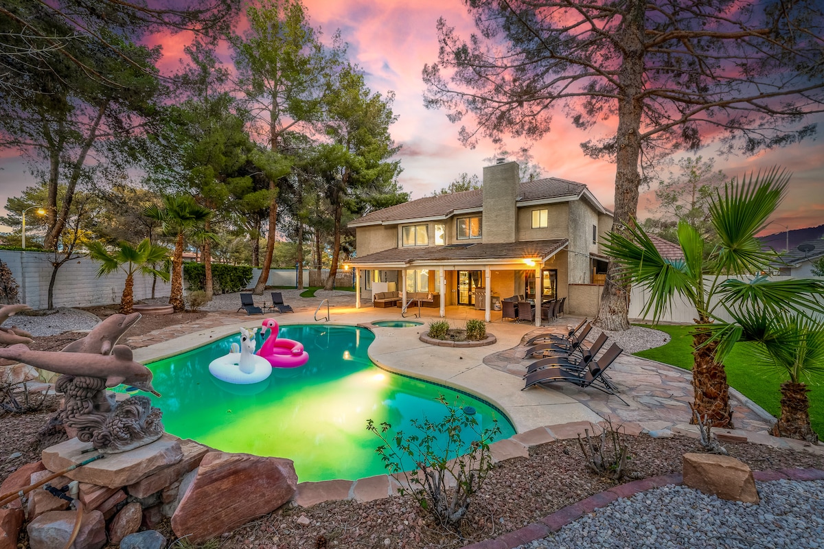 ☞ 2,373 sq feet | 213.7 sq meters. ☞ 5 private bedrooms ☞ 9 beds ☞ Huge private lap swimming pool ☞ Private jacuzzi available year around ☞ 6-person Sauna for relaxing year around ☞ BBQ and pergola ☞ RV Parking and private 2-car garage ☞ E-bikes for rent ☞ Private poker & media room, 75" TV, Poker Table ☞ Full bedroom and bathroom downstairs ☞15 minutes east of the Las Vegas Strip, and airport ☞ Fully equipped kitchen with all oven, dishwasher. ☞ Clark County STVR License Number: 2006540
