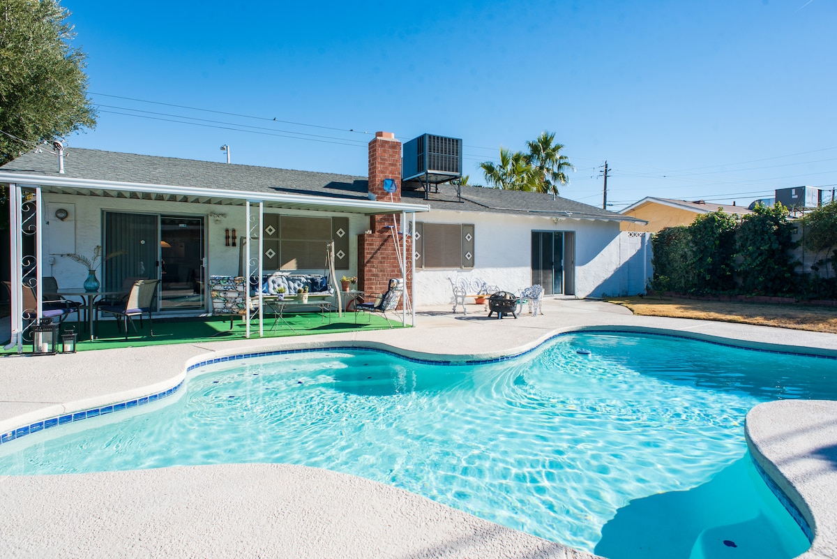 Thoughtfully designed and newly renovated, this Mid Century home with a nod to old school Vegas is perfectly situated in a quiet neighborhood close to everything the city has to offer. The home features a large pool w/incredible outdoor living, game room with a Ping-Pong and Pool table. Luxurious and beautifully appointed, with high-end furnishings and linens. Within minutes of The LV Strip,Convention Center, Downtown & more. License #G66-08101 *Please note- the pool is not heated.