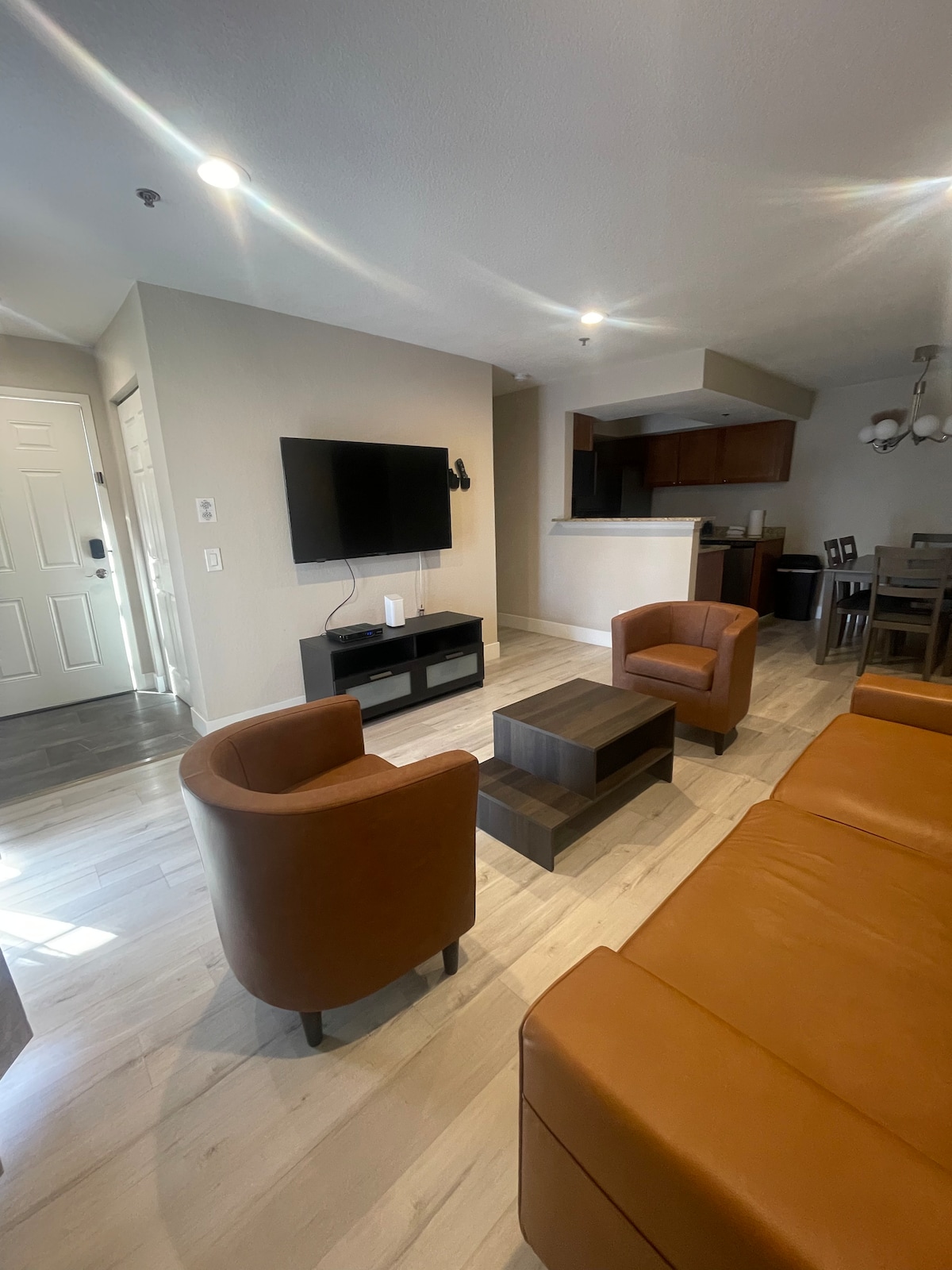 This cozy 1 bed 1 bath condo sleeps 4. It’s comfortable and well appointed with a king size bed, full size sofa sleeper, and self inflating twin, cable/Wi-Fi, 65” smart tv in the living room and 55” smart tv in the bedroom, balcony seating off the living room, remote candle lit fireplace, and modern furnishings throughout. The grounds offer two pools, a Jacuzzi, outdoor shower, gym, 24 hour guard attended entrance, with free parking. Located just off the strip, close to casinos and more.