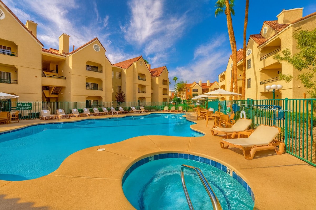 DELUXE 2BD VEGAS CONDO! WATERSLIDE! SUPER SPACIOUS feel of home. With 1682sf, this 2BR/2BA condo sleeps 6 w/2 king beds and sofa bed in living area. Full kitchen, 2 full baths, complimentary Wi-Fi & private balcony. Amazing pool w/Mayan Pyramid cascading waterfalls w/water slides, on-site restaurant, pool bar, BBQ grills, EV charging, gym and more! Great location near the strip YET tucked away for the ideal Vegas experience. Guests LOVE this place & give GREAT reviews! Bring the whole family!
