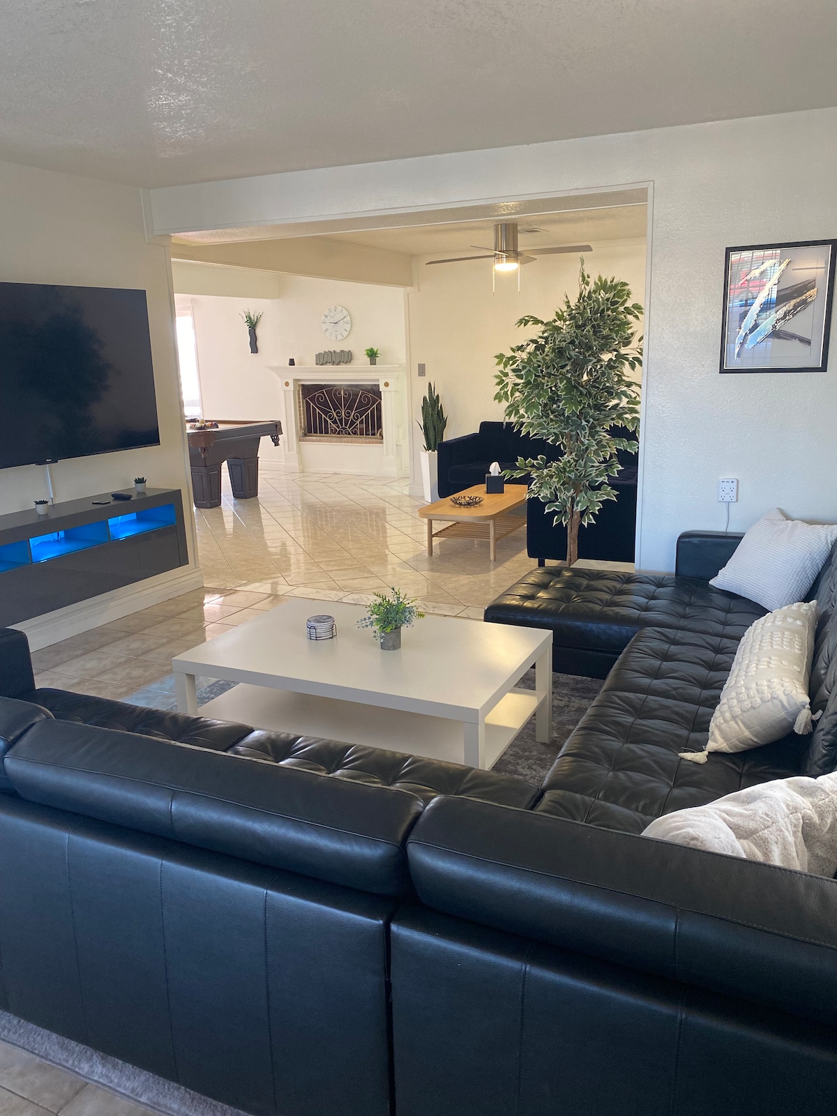 This home was completely remodeled from the floors to the ceiling, all the way to the outside activtities and enviorment. Waterfall counter in the fully stocked kitchen ready to host your friends and family. Five 75-65 inch TV's throuhgout the home. Fun activities are inside and out with a ring toss, pool table and darts inside to horseshoes and cornhole outside. This home is ready to help make your trip to Las Vegas unforgettable. It's our pleasure to host you. Enjoy Your Stay!