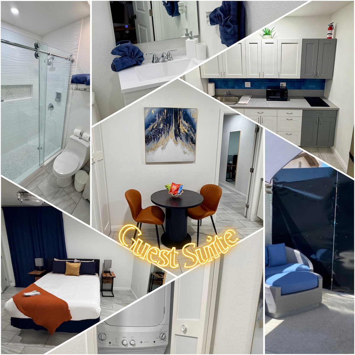 Your beautiful 1-bedroom private suite awaits, featuring a studio kitchen, private full bathroom, dining table, games, workspace, cozy living room with coffee bar. Relax in your private oasis with a beautiful backyard, big pool (3-10ft deep) and heated spa. Perfect to unwind after a thrilling day in Vegas. Suitable for a romantic getaway, family trip, or solo vacation! Book now and experience your ultimate vacation! Enjoy total privacy with a separate entry and no host interaction.