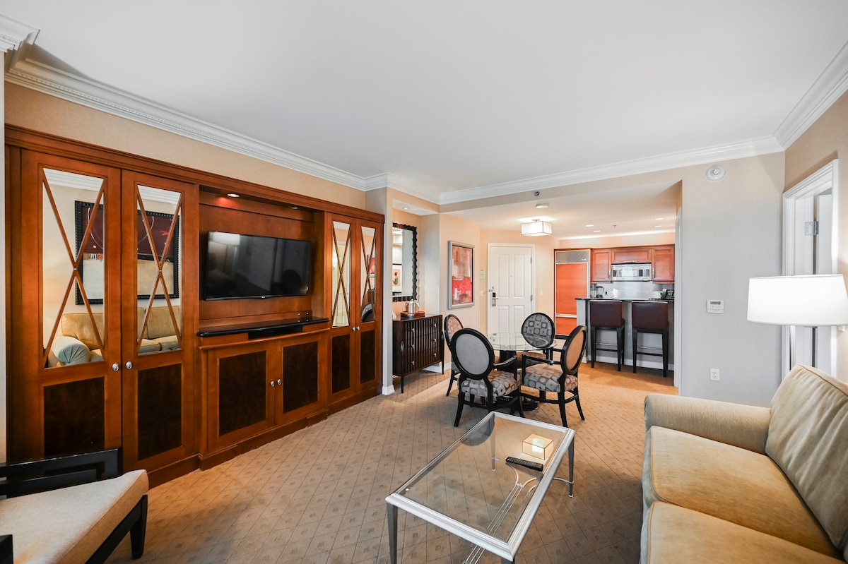 This 631 square foot studio suite is fully equipped and perfect for individuals or small groups who want the Vegas experience while also enjoying the amenities of a home. This luxurious studio is both spacious and welcoming with an unbelievable view. This studio will accommodate up to 4 guests with a King bed and a full size pull out sofa sleeper. • NO RESORT FEE • Free Wifi • Access to pool and fitness center • Walking distance to the Las Vegas Strip and TopGolf • Complimentary parking