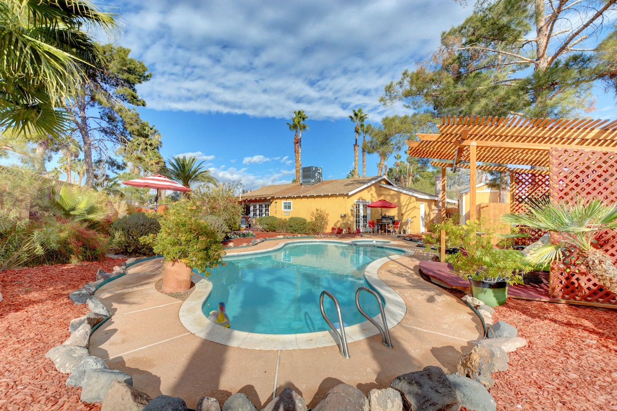 Your beautiful 1-bedroom private suite awaits, featuring a studio kitchen, private full bathroom, dining table, games, workspace, cozy living room with coffee bar. Relax in your private oasis with a beautiful backyard, big pool (3-10ft deep) and heated spa. Perfect to unwind after a thrilling day in Vegas. Suitable for a romantic getaway, family trip, or solo vacation! Book now and experience your ultimate vacation! Enjoy total privacy with a separate entry and no host interaction.