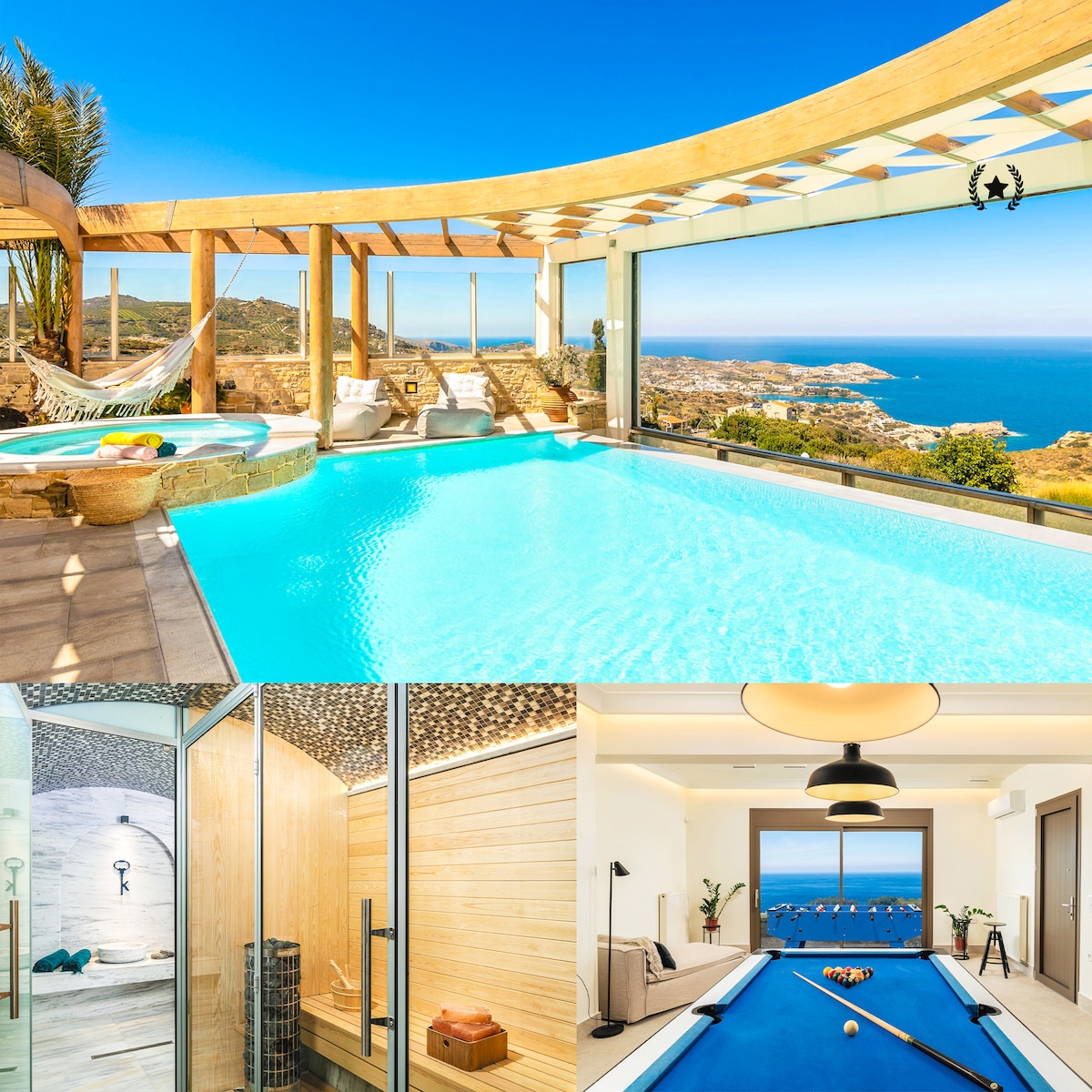 Discover Villa Blue Key, a luxury villa nestled in the serene hills of Agia Pelagia, just minutes from Lygaria Beach and a short drive to Heraklion city centre. This private villa sleeps up to 14 guests and offers upscale amenities, panoramic sea views, and complete privacy for an unforgettable stay in Crete. • Heated Saltwater Pool & Hot Tub • Jacuzzi, Sauna & Gym • Home Cinema, Billiard Table & Ping Pong • BBQ, Pizza Oven, Kid’s Playground • 10 min to the beach & 20 min to Heraklion