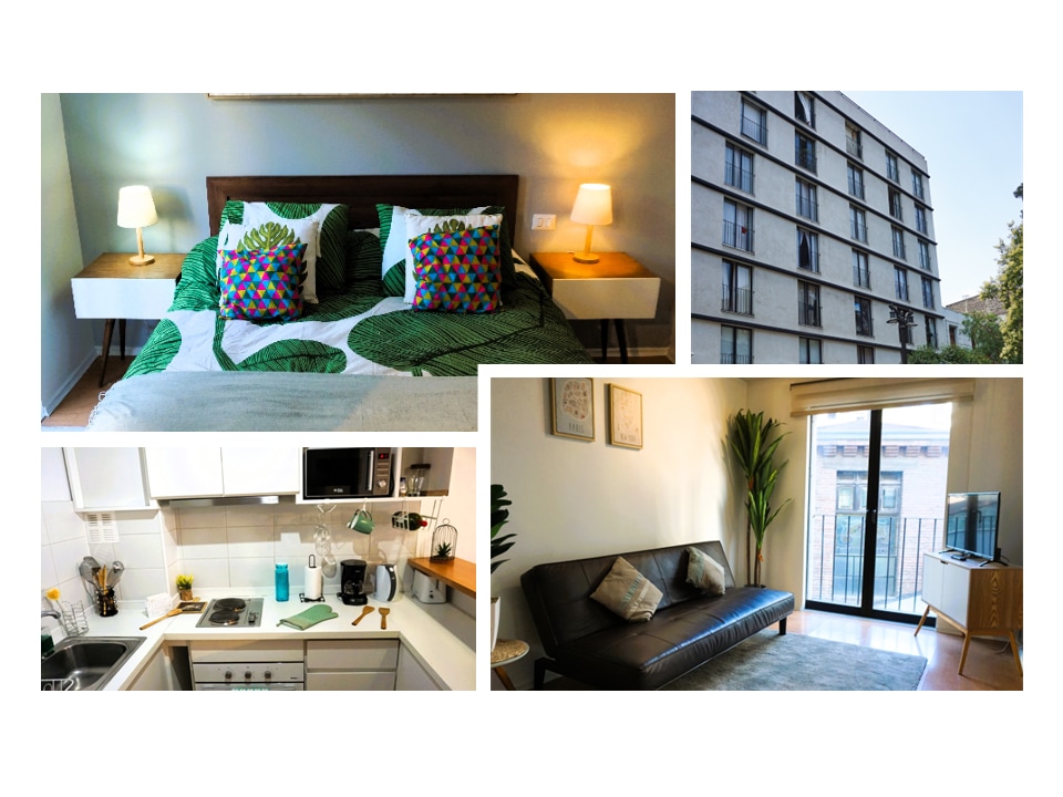 This apartment is ideal for relaxing and enjoying the city. It's centrally located, between the Santiago Centro and Providencia districts, one of the best locations in the city. It offers beautiful views of San Cristóbal Hill and the Sky Costanera. It's just a 3-minute walk from the metro and buses. Includes: Free Wi-Fi, a fully equipped kitchen, sheets and towels included, a large bed with a large Smart TV. Self-service entrance with a key, allowing you to arrive at any time.
