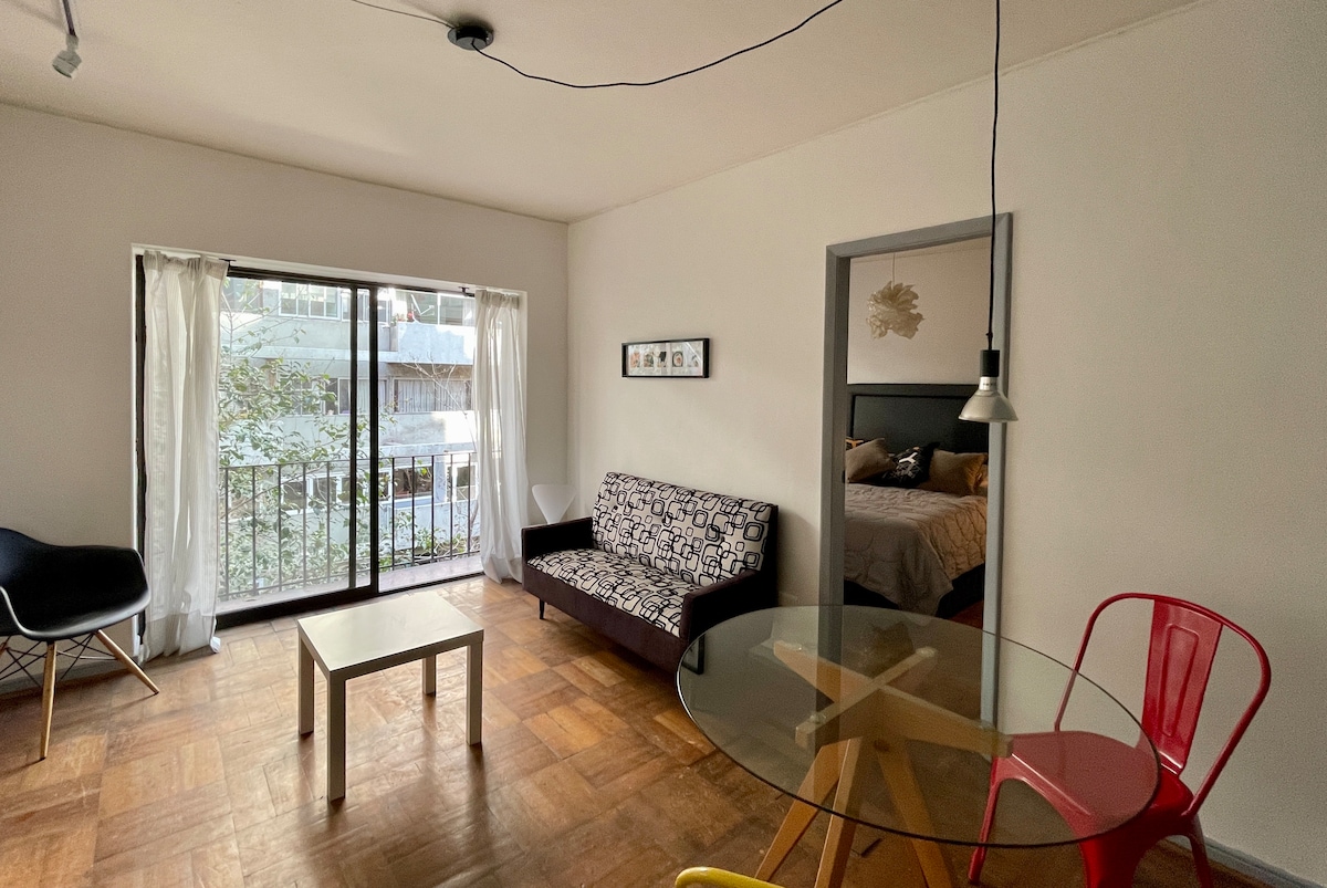 Modern apartment in Bellavista/Providencia, just steps from Metro Salvador. Perfect for couples or business travelers. Enjoy ultra-fast WiFi (561 Mbps), a bright bedroom with a double bed, a fully equipped kitchen, a cozy living room, and a private balcony with greenery views. The building offers a laundry room, elevator, and 24/7 security. Excellent location near San Cristóbal Hill, Patio Bellavista, and restaurants.
