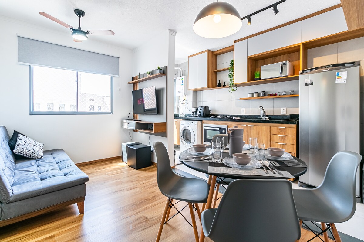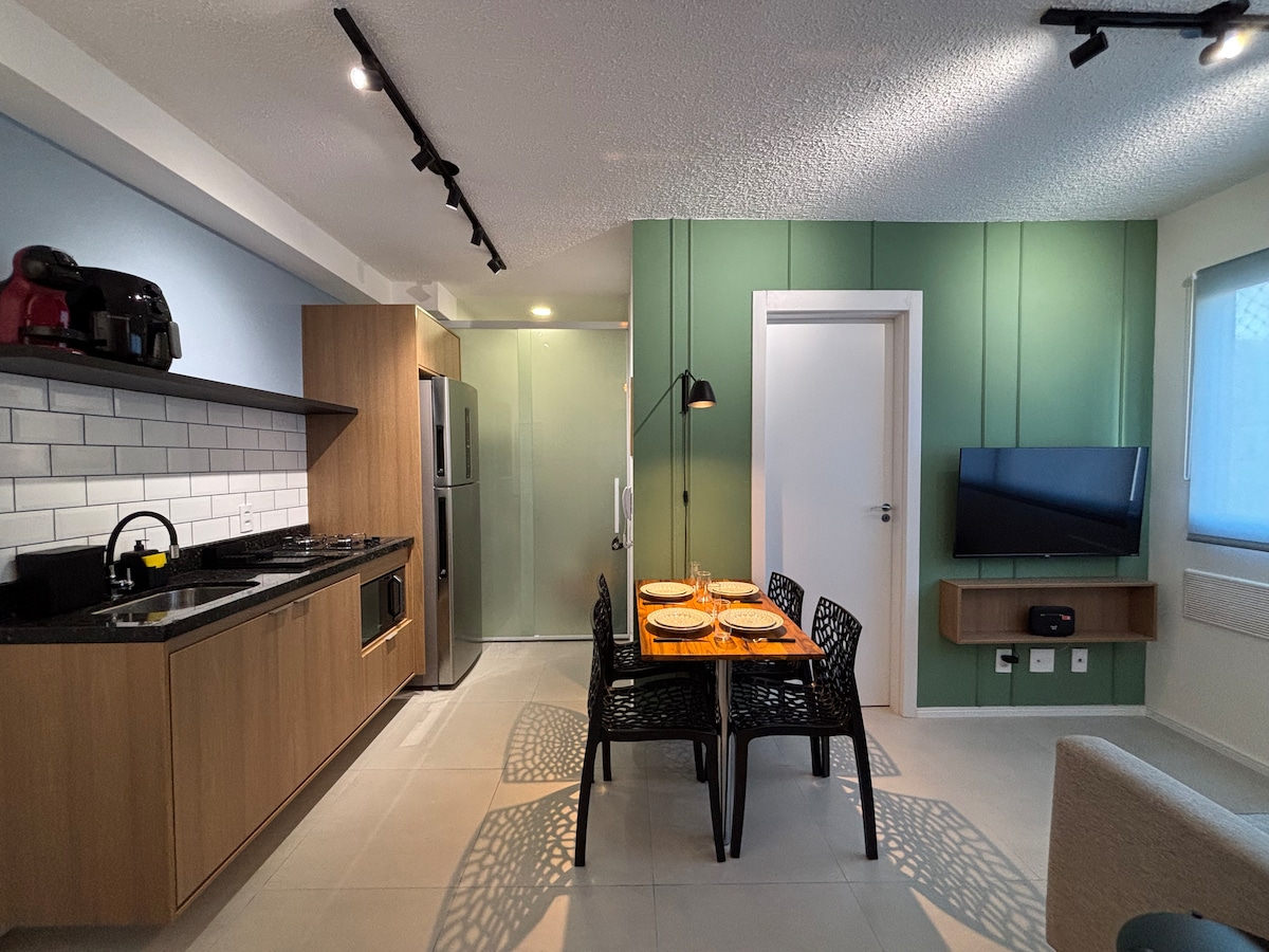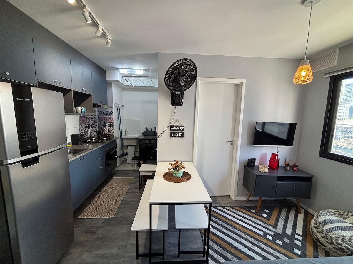Brand new apartment, with a contemporary style, of a high standard and very well located, with a privileged view of Allianz Parque. Next to shopping malls, various businesses, means of transport, parks, tourist attractions and business buildings. The studio is complete, with a comfortable queen bed, Smart TV and Internet. Kitchen with all utensils, cooktop, refrigerator and microwave. With parking (rotary). Close to everything, cozy, perfect for experiencing fantastic moments.