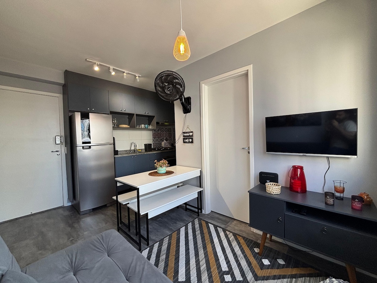 Brand new apartment, with a contemporary style, of a high standard and very well located, with a privileged view of Allianz Parque. Next to shopping malls, various businesses, means of transport, parks, tourist attractions and business buildings. The studio is complete, with a comfortable queen bed, Smart TV and Internet. Kitchen with all utensils, cooktop, refrigerator and microwave. With parking (rotary). Close to everything, cozy, perfect for experiencing fantastic moments.