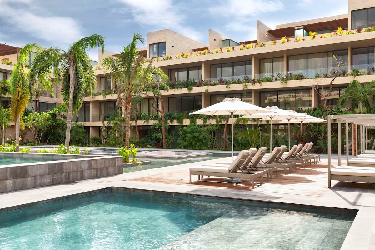 Brand new modern upstairs studio with a king bed, bathroom, and bright open design. Floor-to-ceiling doors lead to a lush terrazzo terrace surrounded by tropical plants and morning sun. Enjoy warm wood details, plenty of natural light, and a calm airy vibe. Perfect for couples or solo travelers seeking a fresh, stylish stay just steps from San Pancho’s beach, cafés, and main street. Equipped with Starlink Wifi! This unit is located above Casita Rubia overlooking the shared pool and patio.