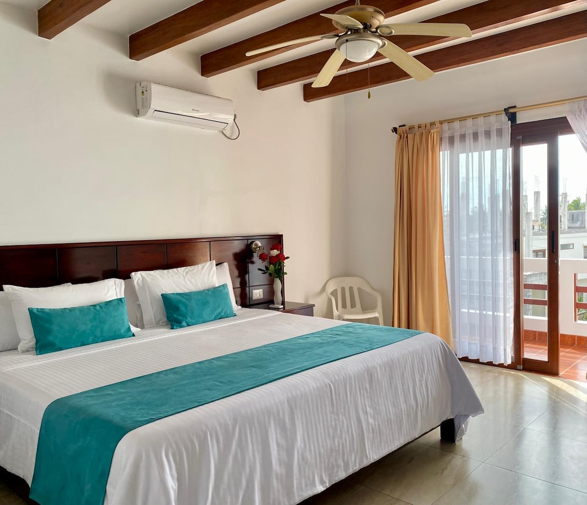 Disfruta de una estancia cómoda y relajante en esta hermosa habitación privada dentro de nuestro hogar. - Habitación: amplia, privada, iluminada, agua caliente, con baño privado, wifi-Starlink, aire acondicionado, balcon. -Áreas comunes: cocina, patio, área de hamacas, terraza. -Ubicación: Jeniffer Hostal, ubicado en Isabela Galápagos, Ecuador. En el centro de la población de Puerto Villamil, a cinco minutos de la playa y cerca de restaurantes, cafeterías, operadoras turísticas, entre otros.