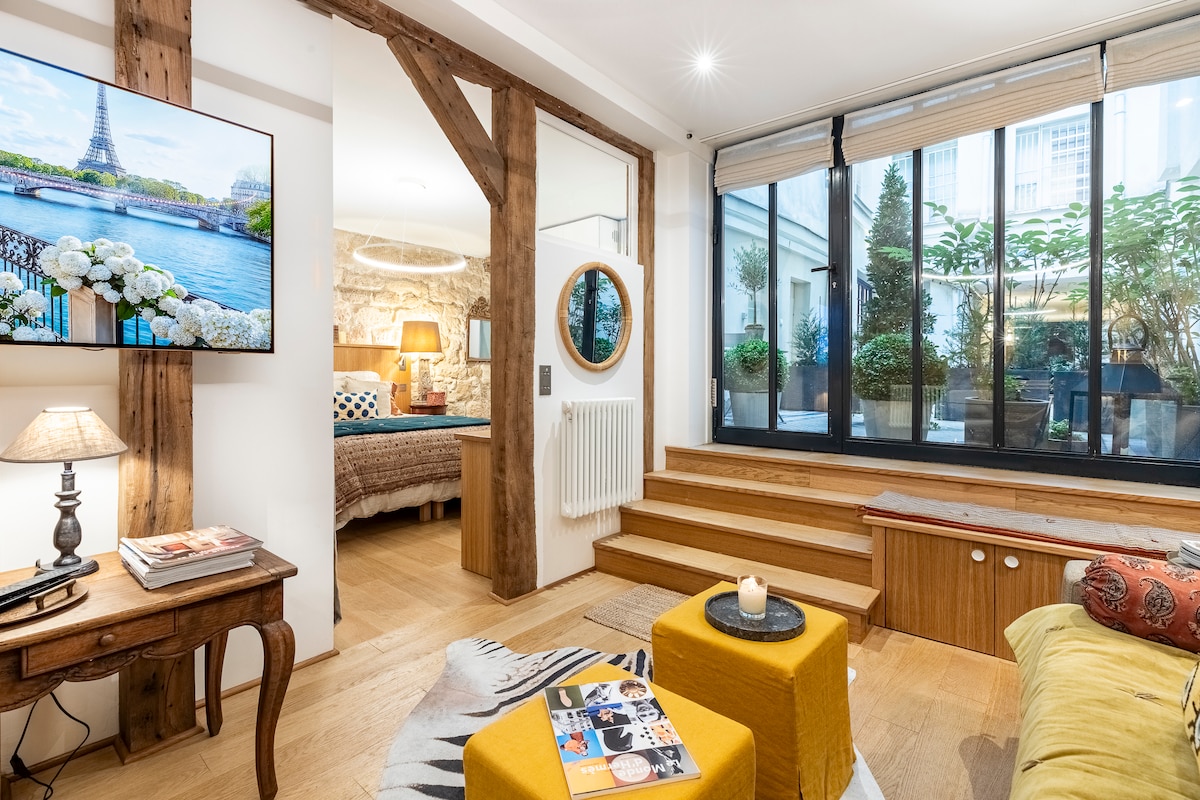 Luxurious and intimate, this secluded urban oasis is tucked away on a residential street in bustling Bastille, one of the most authentic and hippiest areas of Paris. Surrounded by some really good restaurants, farmer markets, designer stores and art galleries, it offers all the amenities you would find in a 5-star hotel, including a secluded private outdoor patio with its lush greenery. Famous Place des Vosges and Le Marais are just a short walk away.