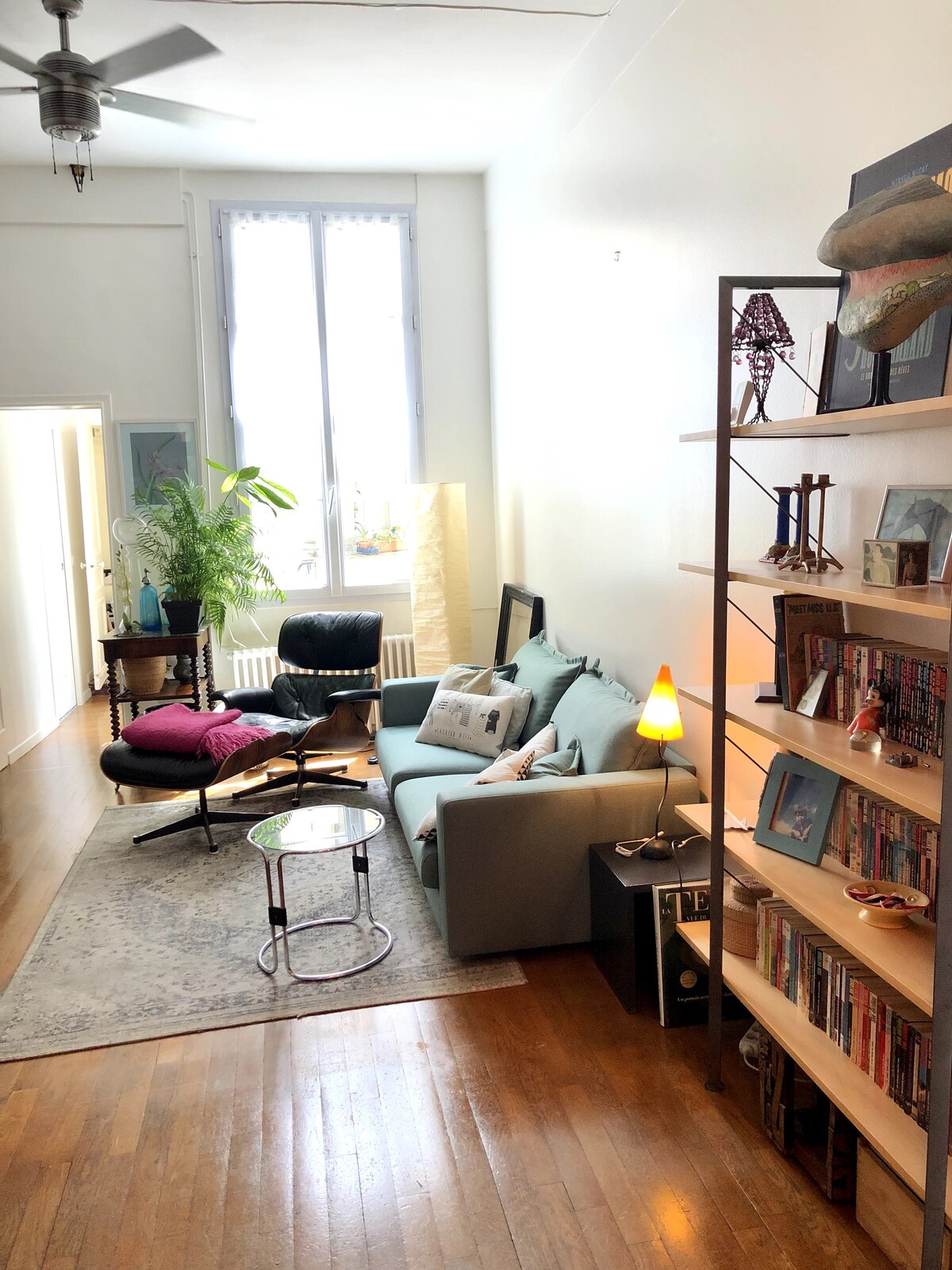 Charming apartment, very central, in the heart of the Marais. The apartment is 53 m2 including veranda, 2nd floor without elevator. It is organized like a 3-room apartment but, be careful !, it has no walls between the day and night areas. It is suitable for 3 persons. The 2nd bed is 120 cm wide and can possibly be suitable for 2 children or a couple. I live in this apartment, I have chosen each thing carefully, with the result that it feels really cosy.