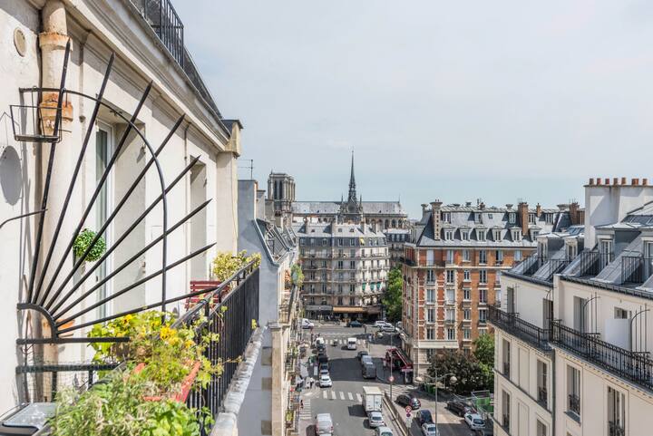 Yes, this is exactly the view from your window. For your honeymoon or just for a breakfast facing Notre Dame on your own balcony, in your Parisian home, Severine. Look over the Seine and the rooftops, the sun is fading behind Notre Dame and the sky turns 50 shades of red. To get to your penthouse 3rd floor 1BDR duplex with Air conditioning, there are 3 floors to climb in our historical 400 years old building in the very heart of the city, but the romantic place is worth it, ask our guests...