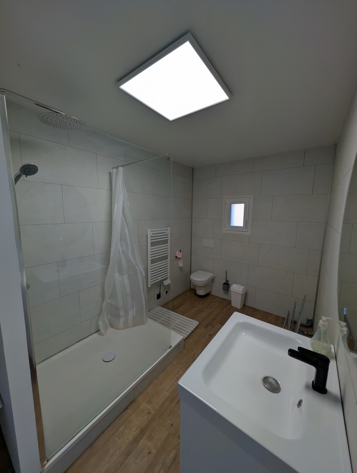 apartment 60 m2, brand new, all equipment Huge main room (28 m2) with integrated kitchen (dishwasher, expresso machine, ...), front to huge wooden deck with private heated swimming pool 10x5m secured by rolling shutter, nice view on Garonne valley, nice garden, land 2500 m2, two rooms (11,5 m2 each), bathroom, separated toilet The upper part of the house is where we live.
