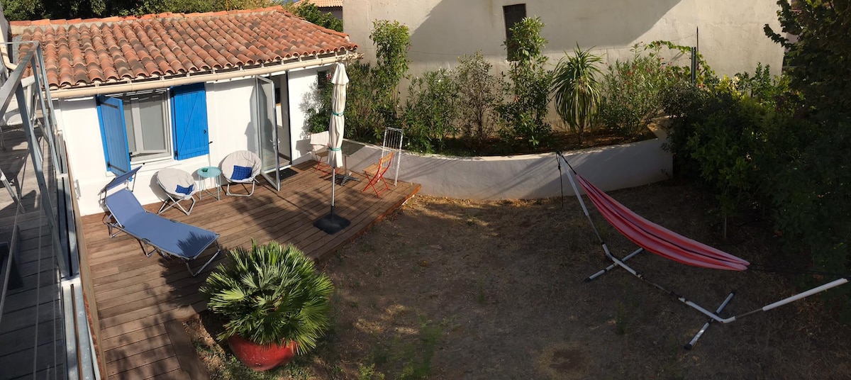 IDÉAL COUPLE - Nichée dans notre jardin, une petite maison indépendante vous attend. A l'ombre de notre figuier et de nos grands pins, ce logement est idéalement situé pour vos vacances à Sète. Au cœur du quartier de la Corniche, vous y trouverez de la quiétude pour vous rafraîchir après vos journées de visites ou de plage. Les plages (crique de l'Anau, plage du Lazaret) sont accessibles à pied (800m), la plage de la Baleine et le centre ville sont à 5 min en voiture. Stationnement très facile.
