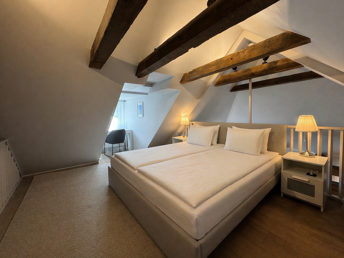 The apartment is located in a historic building and does not have a lift. A spiral wooden staircase leads to the apartment, which we restored with care and love to preserve the architectural heritage.