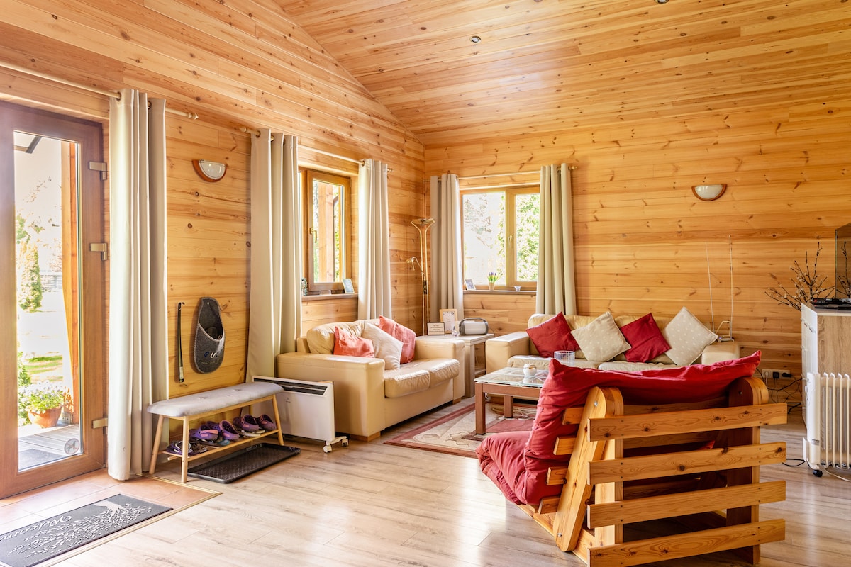 Relax and enjoy our single level wooden house built 2022 It has a large lounge with wood burner 2 bedrooms 1 double 1 twin , separate kitchen well equipt and Modern Shower / toilet room . Set in large gardens with secure parking for 2 cars .....has natural wooden interior that has the presence of space, peace and comfort .It is is also suitable for those with limited mobility being on a single level . We have Hot Tub for extra cost We also have sauna subject to availability.