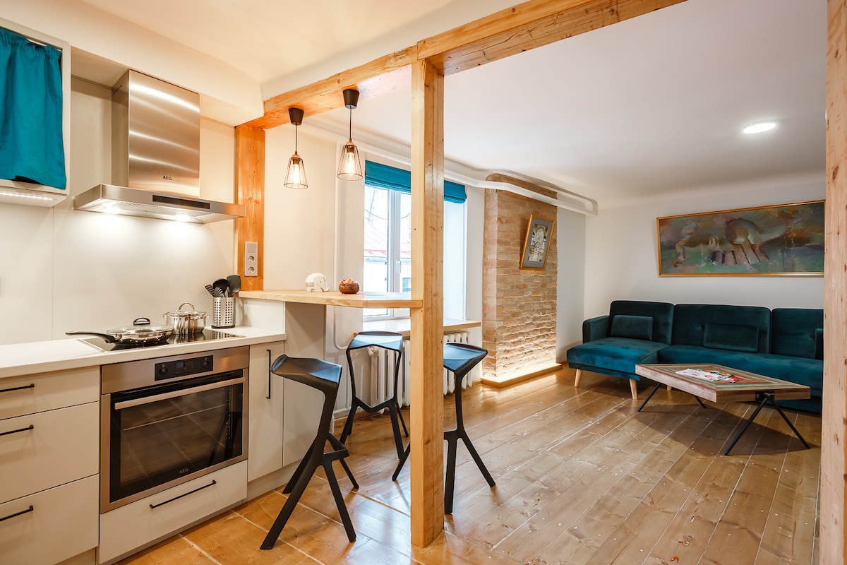 This special place is an authentic & lovely 1 bedroom apartment in the center of Riga! It is close to everything, making it easy to plan your visit,but at the same time it is nice & quiet. There's parking in the courtyard! The apartment has a comfy bedroom as well as an awesome kitchen and living room area. The fireplace gives a rustic & cozy atmosphere - reminiscent of staying in a small cabin in the woods. Please get in touch with us in case you have any questions before booking Welcome :)