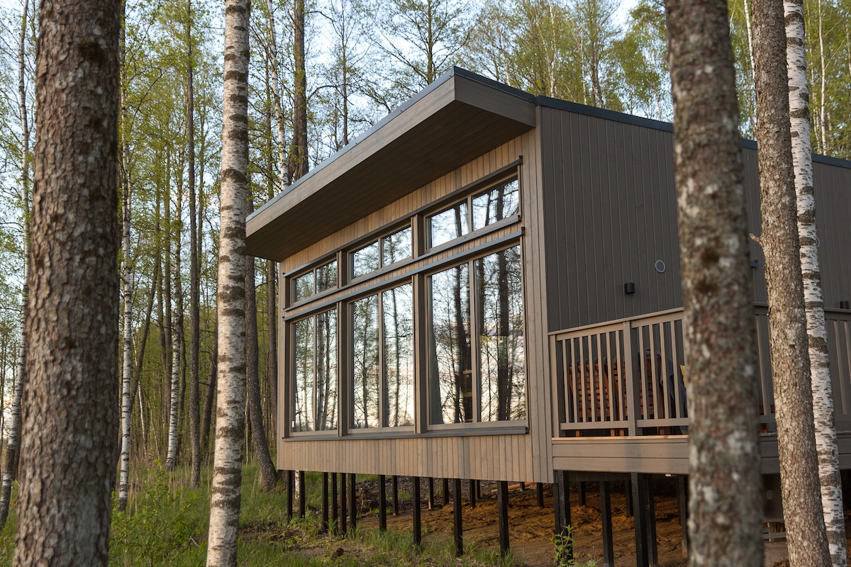 Escape to a secluded lakeside haven for a cozy and romantic holiday experience. Nestled by a tranquil lake with no neighbors in sight, it boasts an intimate connection with nature through huge windows, offering great views of the surrounding forest. Immerse yourself in luxury with a Jacuzzi strategically placed in front of these windows, creating unique experience. Unwind by the fireplace or indulge in the soothing atmosphere of a sauna. Your perfect getaway, surrounded by nature's serenity.