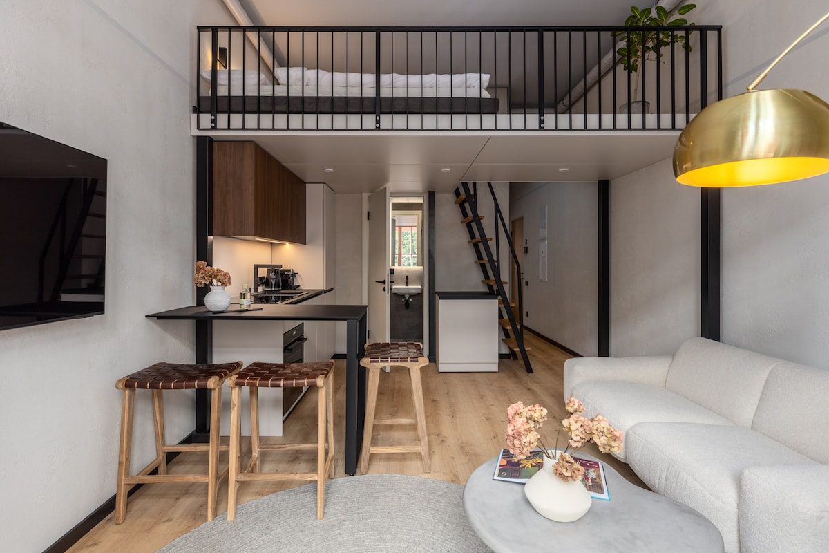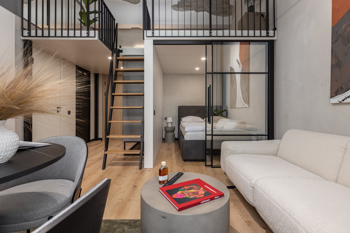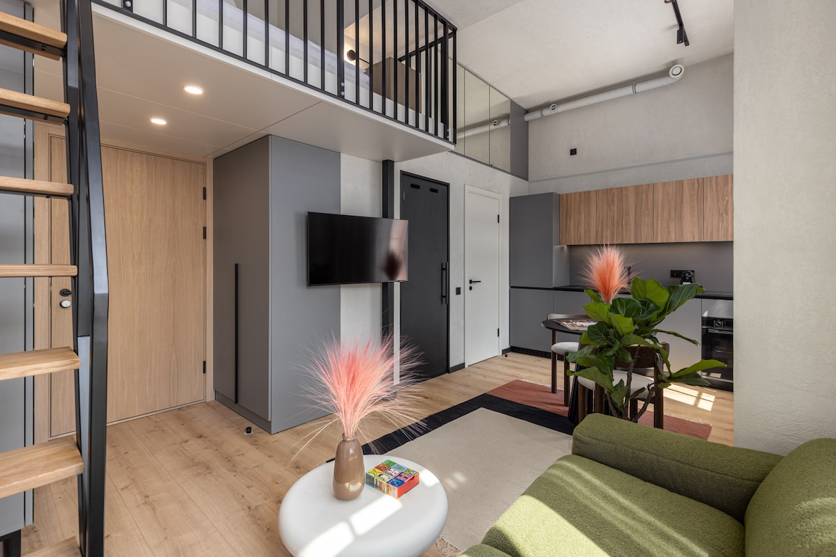 Welcome to Hallo Loft! Discover our sophisticated and cute studio apartment with an amazing loft sleeping area in the heart of Riga. Featuring a sleek design with modern furnishings and stylish accents, this space includes a fully equipped kitchen, a modern bathroom, and a comfortable living area with views of a quiet courtyard. Located in the vibrant city center, you’ll be just steps away from cafes, restaurants, shops, and gyms. Experience modern comfort and convenience at Hallo Loft!