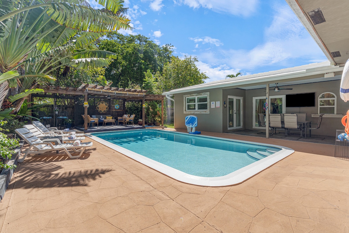 This South Florida canal home located minutes from the beach is nestled in a quiet neighborhood surrounded by water and parks with one way in and out. It sits and the end of a cul-de-sac on it own private road where privacy is at its best! Newly remodeled 3 bedroom 2 bath house with Heated pool. Explore Florida with provided kayaks in the canal that leads to the ocean. Neighborhood parks include, beach volleyball, basketball, nature trails, exercise routes and benches, RV parking, and more.